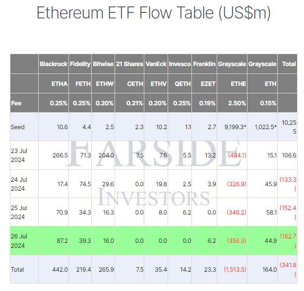 スポット・イーサリアム上場投資信託(ETF)は取引開始後1週間で3億4,000万ドルの純流出を記録したが、これは主にGrayscaleが転換したイーサリアム・トラスト(ETHE)からの大幅な流出による。