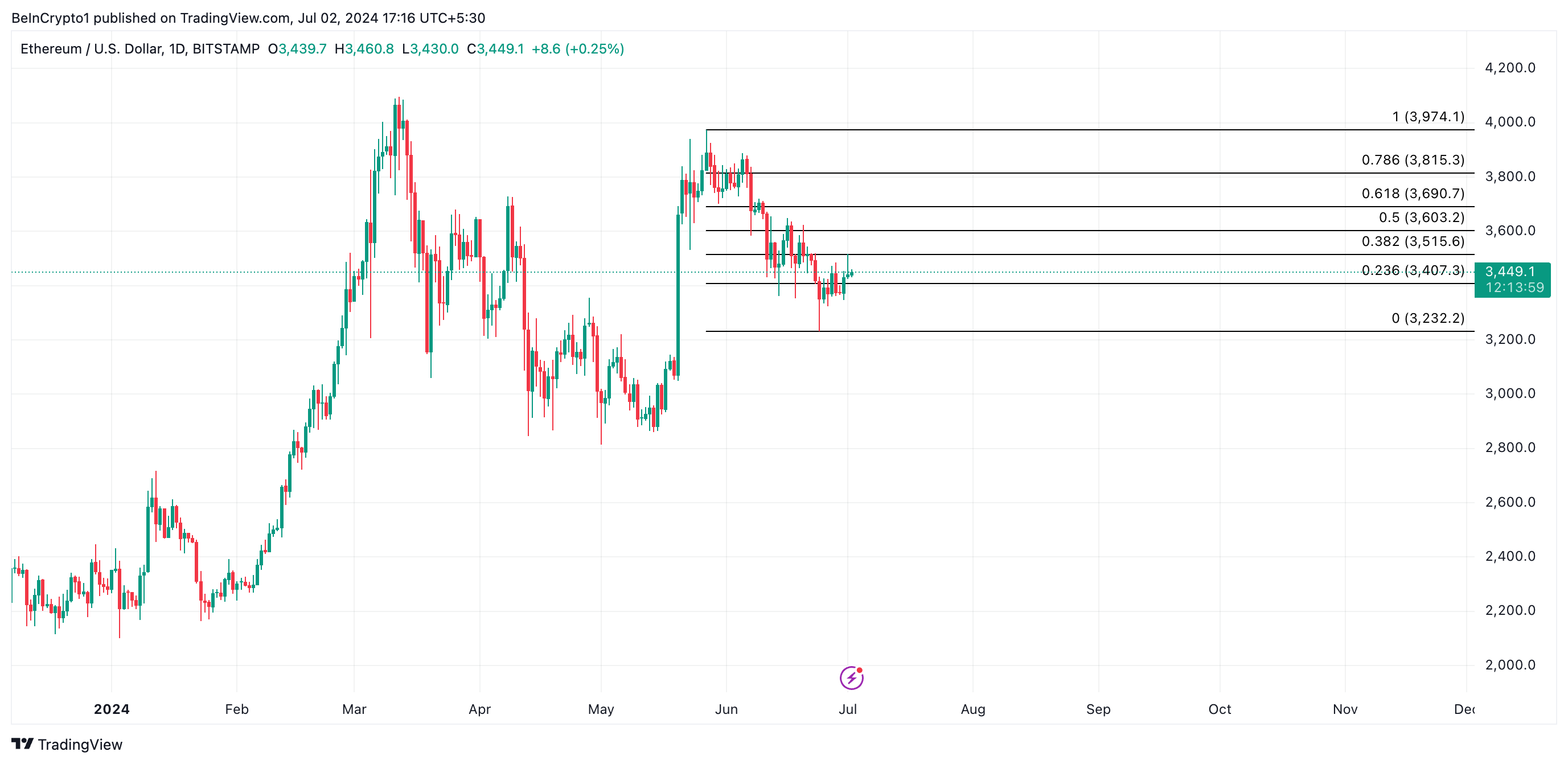 プレスタイム現在、ETHは3,446ドルで取引されている。ETHは6月中旬以降、3600ドルレベルの抵抗に直面し、この1カ月で価格が9%下落した。