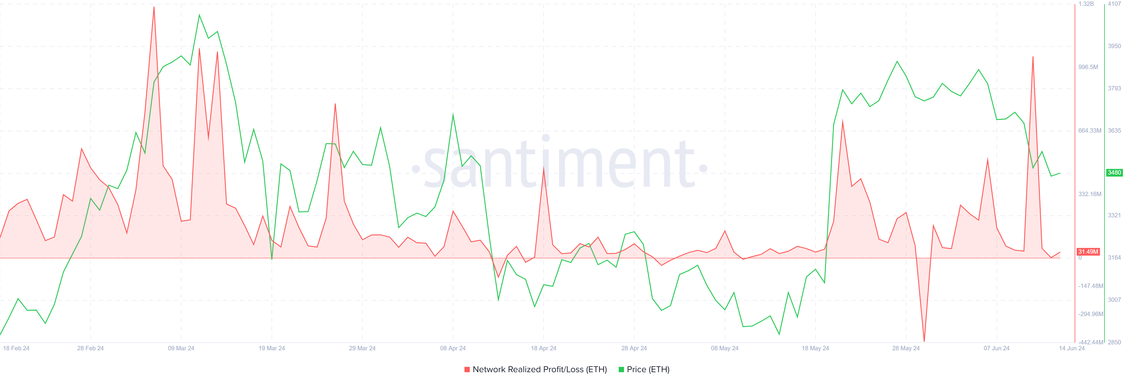 ネットワークの実現損益指標を見ると、ここ数日で利益確定売りが急増している。この指標の急上昇は過去3カ月で最大で、ETHが上昇していた3月にこのような売りが観測されたのが最後だった。しかし、これはさらなる利益に関する楽観的な見方が減少しているために行われている。