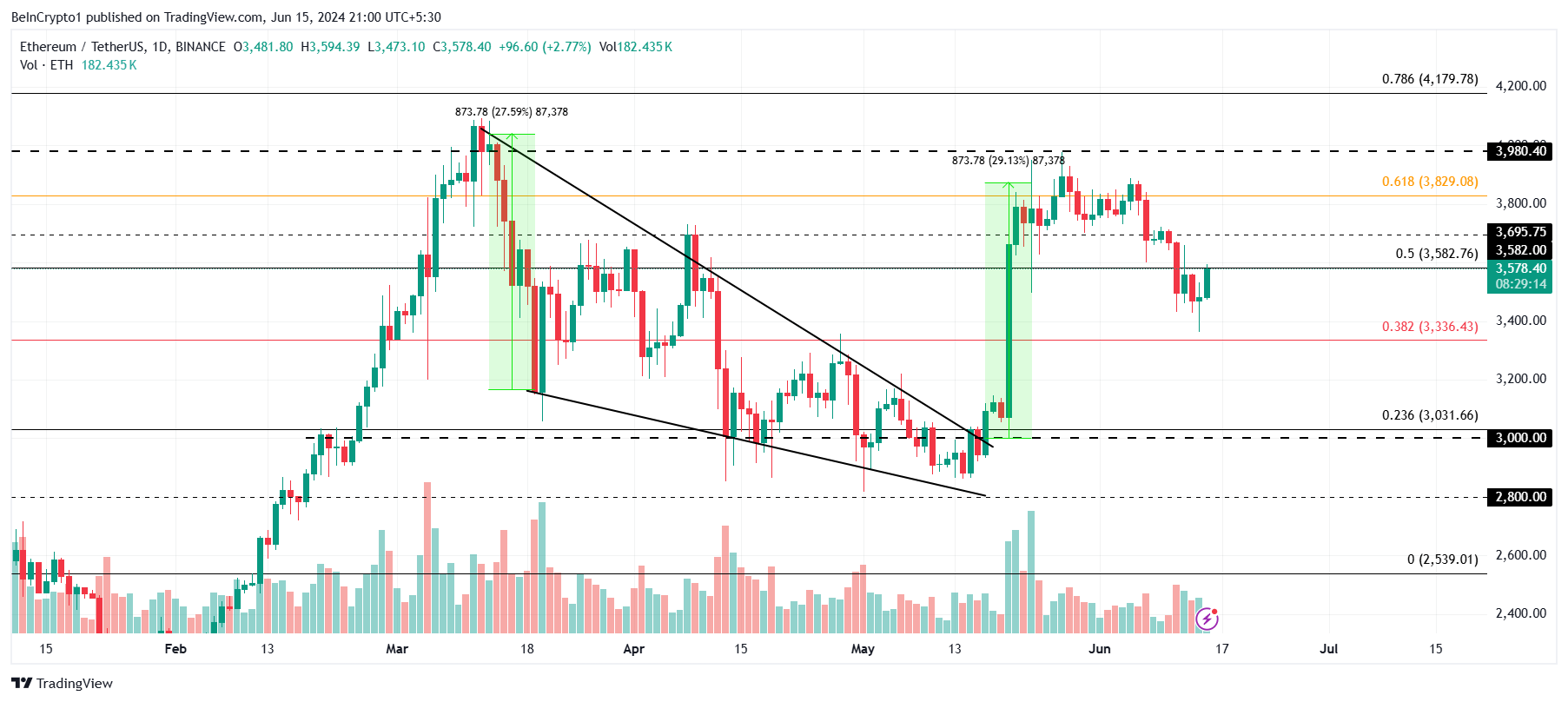 3,578ドルで取引されているイーサリアム価格は、フィボナッチリトレースメント50%レベルの抵抗に直面している。投資家の弱気姿勢が強まる中、この抵抗はさらに強まる可能性があり、ETHは突破に失敗せざるを得ない。