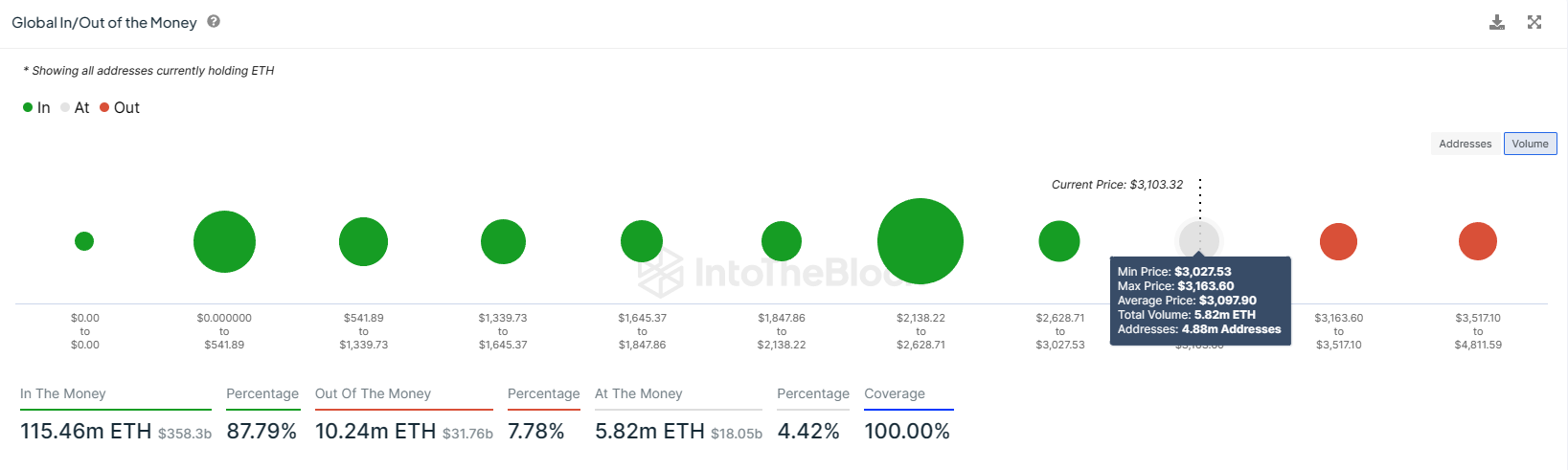 グローバル・イン/アウト・オブ・マネー(GIOM)指標によると、供給は3,000ドルから3,163ドルの間で買われた。この186億5,000万ドル相当のETHは、投資家とクジラを楽観的にさせるだろう。さらに、イーサリアムの価格上昇目標は30%である可能性が高いため、3,163ドルへの上昇はすぐに起こるだろう。