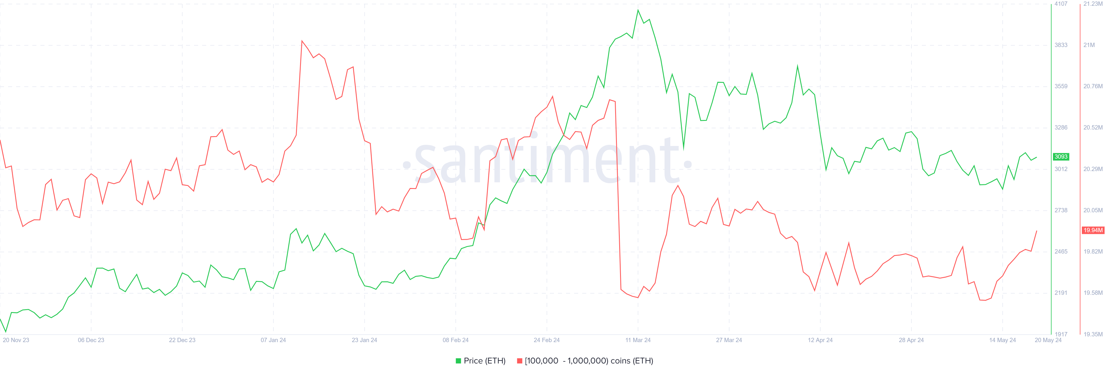 10万ETHから100万ETHを保有するアドレスが39万ETH強、12億6000万ドル相当の供給を追加し、クジラの保有量を1994万ETHに押し上げた。この買い増しは過去1週間に発生した。