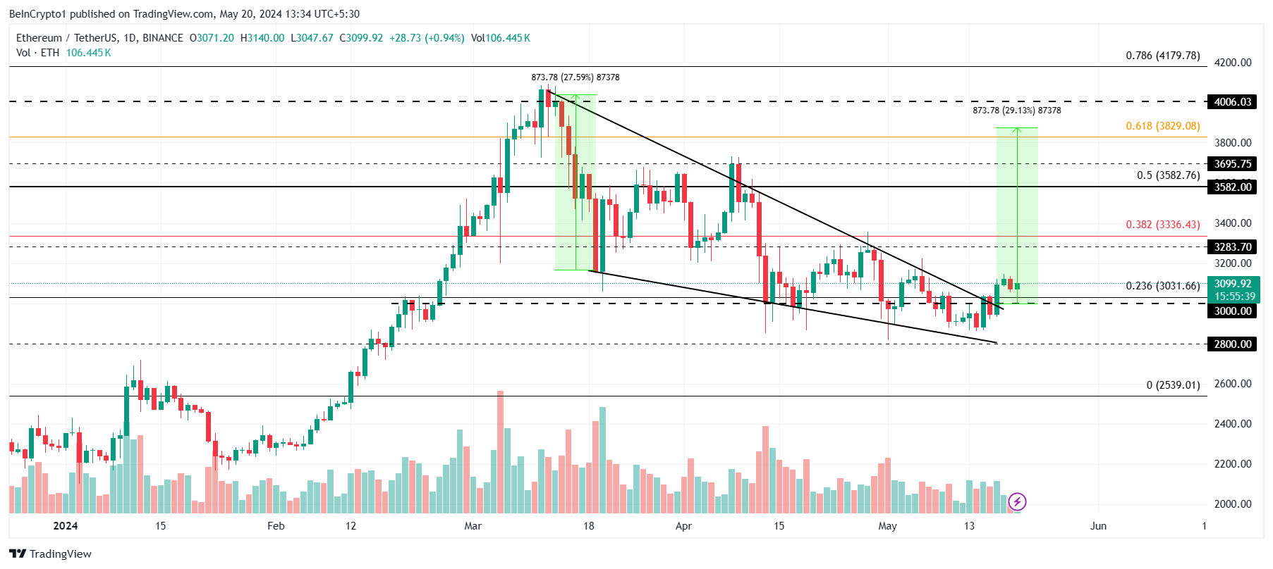 本稿執筆時点で3,099ドルで取引されているイーサリアムの価格は、3,031ドルのフィボナッチリトレースメント23.6%の重要なサポートを上回っている。これは、アルトコインが3月上旬以来続いている下降ウェッジをブレイクしたことにより可能となった。