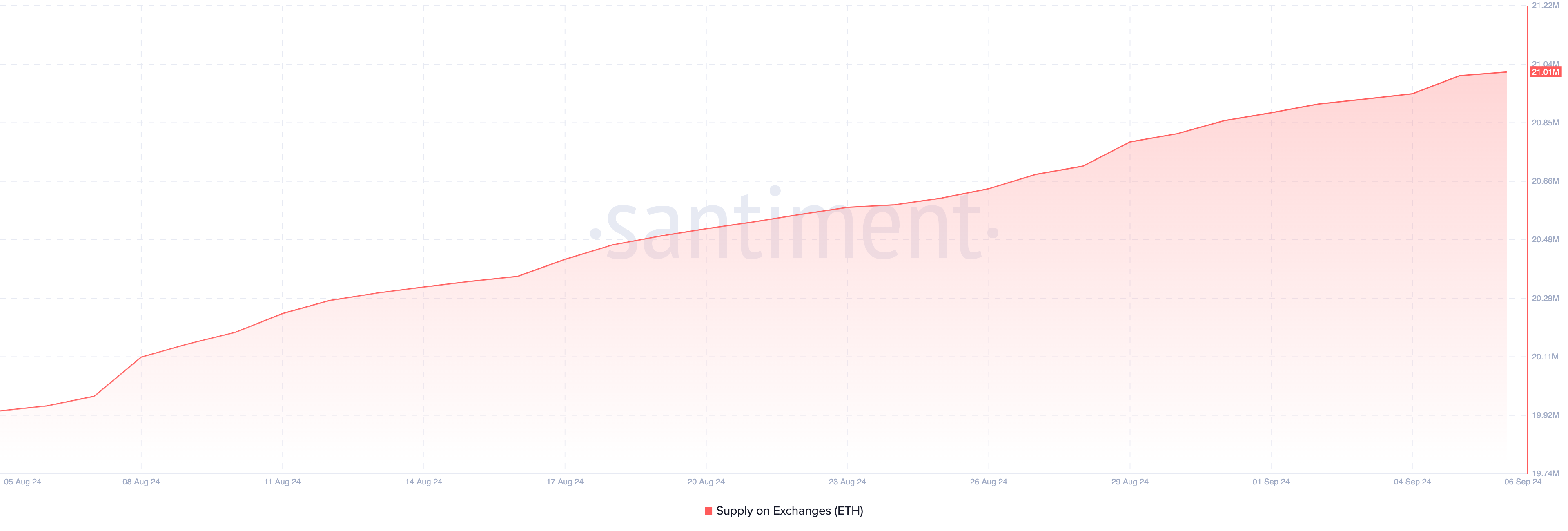 1ヶ月前、取引所のETHの額は1,994万でした。今日、同じ指標は2,100万を超えており、これらの中央集権的なプラットフォームにより多くのコインが流入していることを示しています。