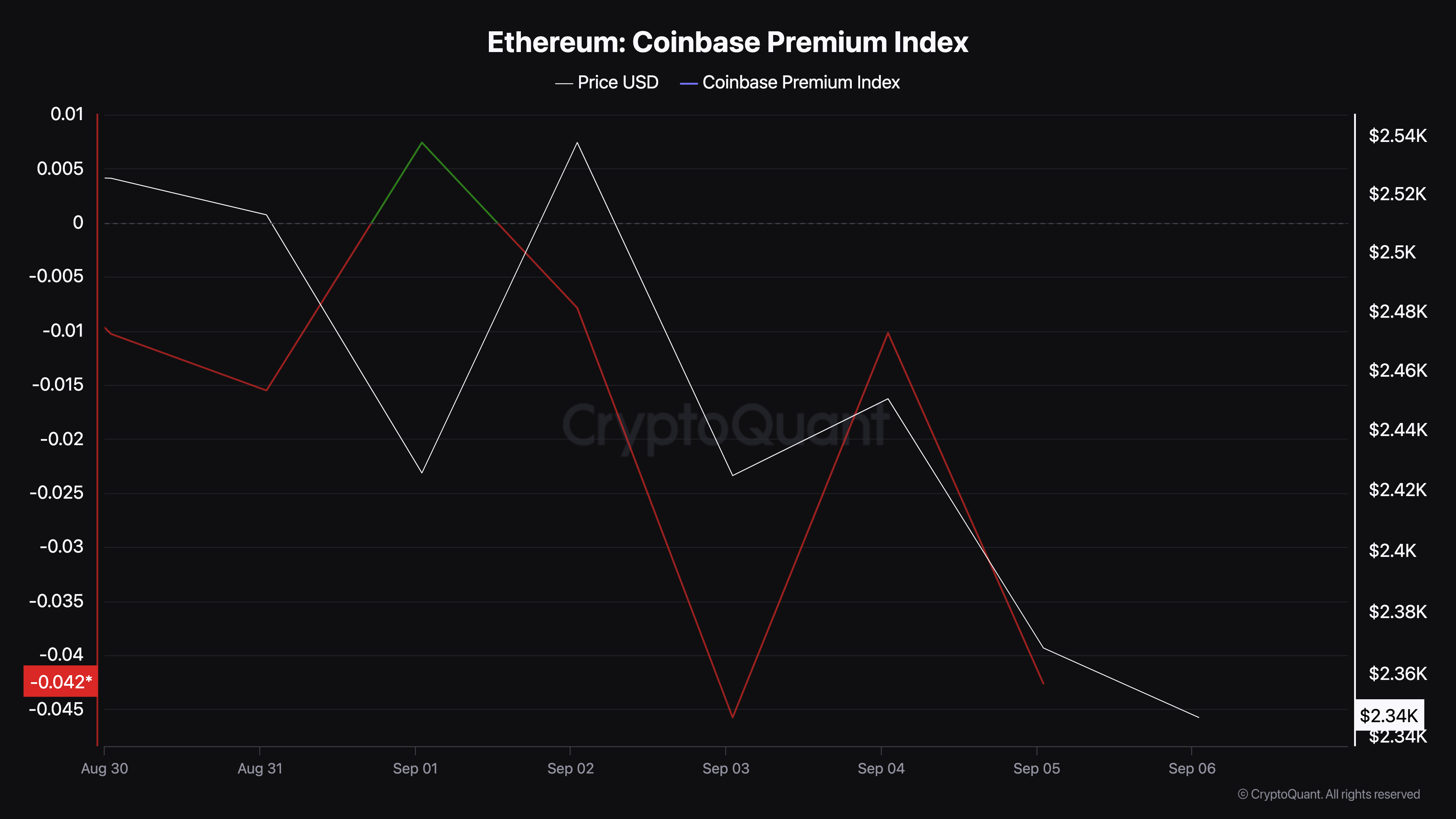8月24日、イーサリアムの価格は2,800ドルに上昇し、暗号通貨が3,000ドルを再テストするのではないかという憶測を呼び起こしました。しかし、 ETHは下落を続けているため、そうはなりませんでした。プレス時点では、イーサリアムのコインベースプレミアムインデックスは急落しており、価格が再び顕著な下落に屈する可能性があることを示唆しています。