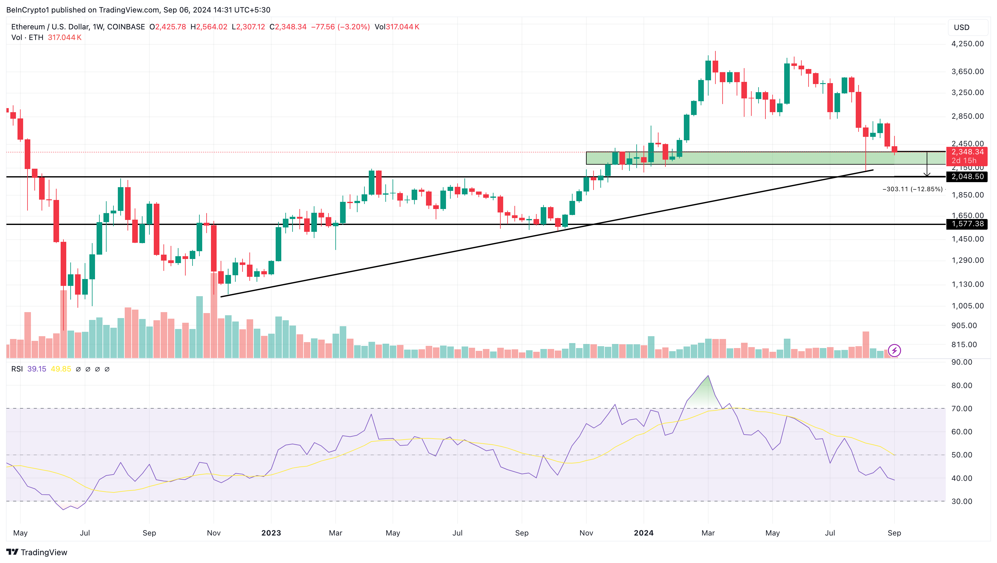 この記事を書いている時点では、イーサリアムの価格は2,345ドルで、2,200ドルから2,350ドルの需要ゾーンの間にあります。アルトコインがこのゾーンの下限を下回った場合、その価格は2,048ドルに下落する可能性があります。