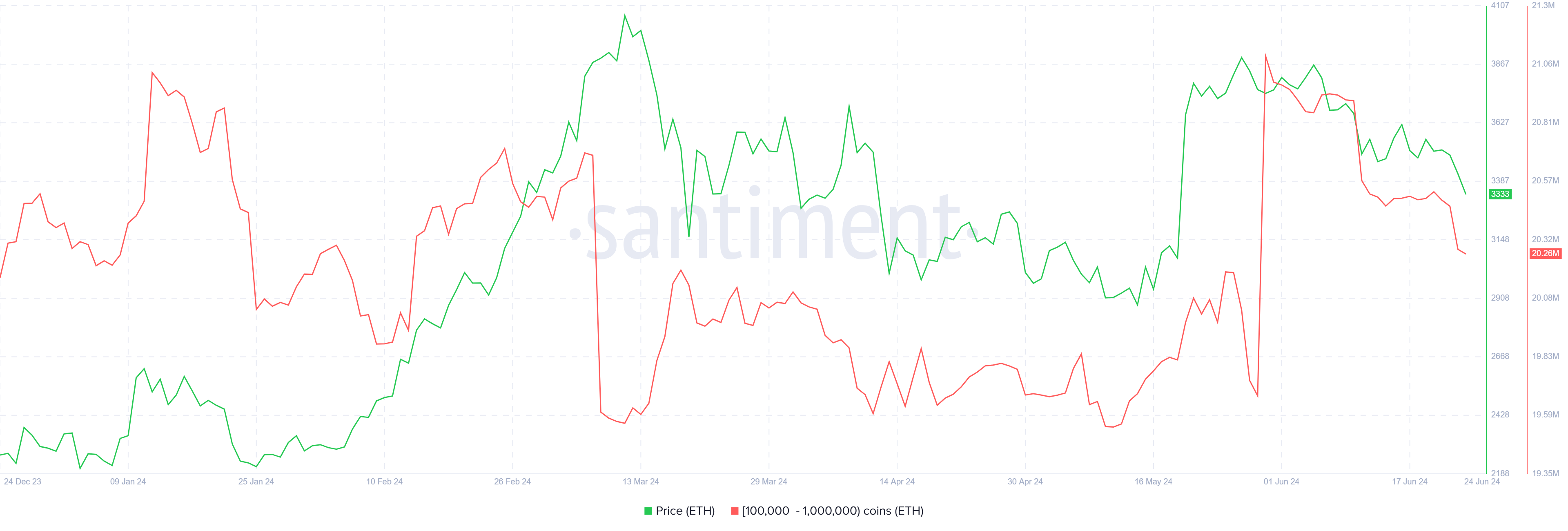 クジラは最大のウォレットを持っていることから、資産に最も大きな影響を与える傾向があります。しかしETHの場合、クジラは利益をあまり期待していないように見える。10万ETHから100万ETHを保有するアドレスは、過去2週間で7億ETH近くを売却した。