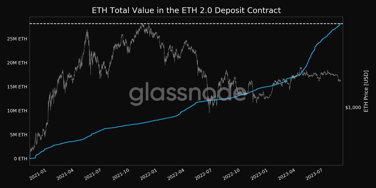 暗号資産(仮想通貨)イーサリアム(ETH)におけるステーキング量の急増がこのほど観測され、暗号資産取引所における保有量の2倍近くに達した。オンチェーン分析ツールGlassnodeによると現在、イーサリアムのステーキング量は2800万ETHを超える一方、暗号資産取引所の残高は1470万ETHまで減少している。