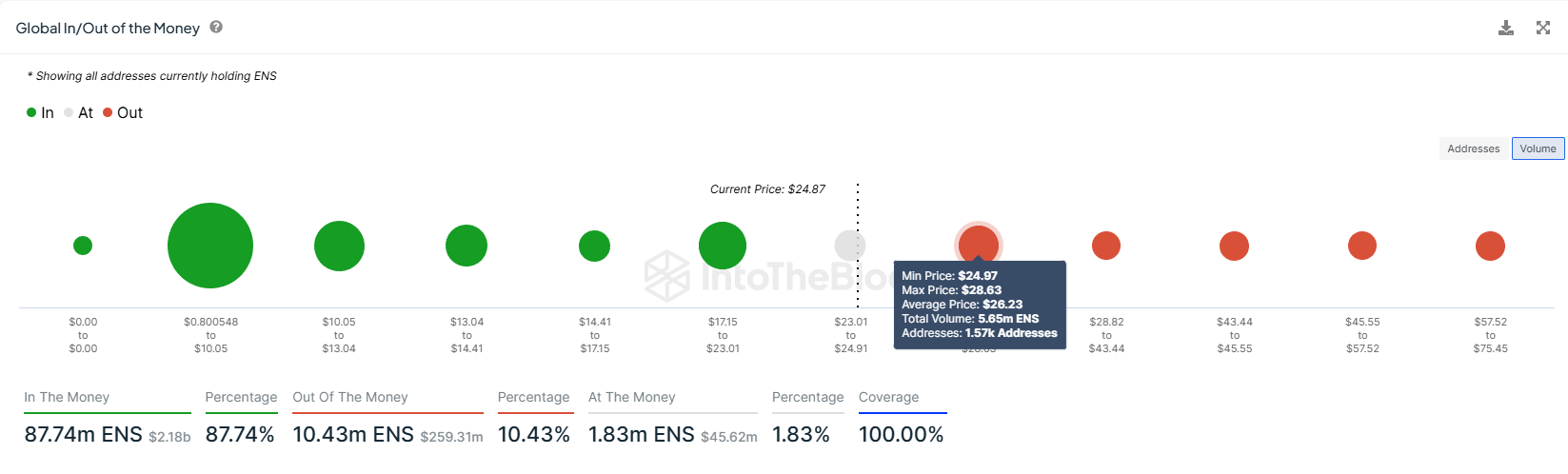 イーサリアムネームサービス(ENS)価格は20日、日足チャートに赤いローソク足を描きながら、26ドル以上でのクローズを試みた。