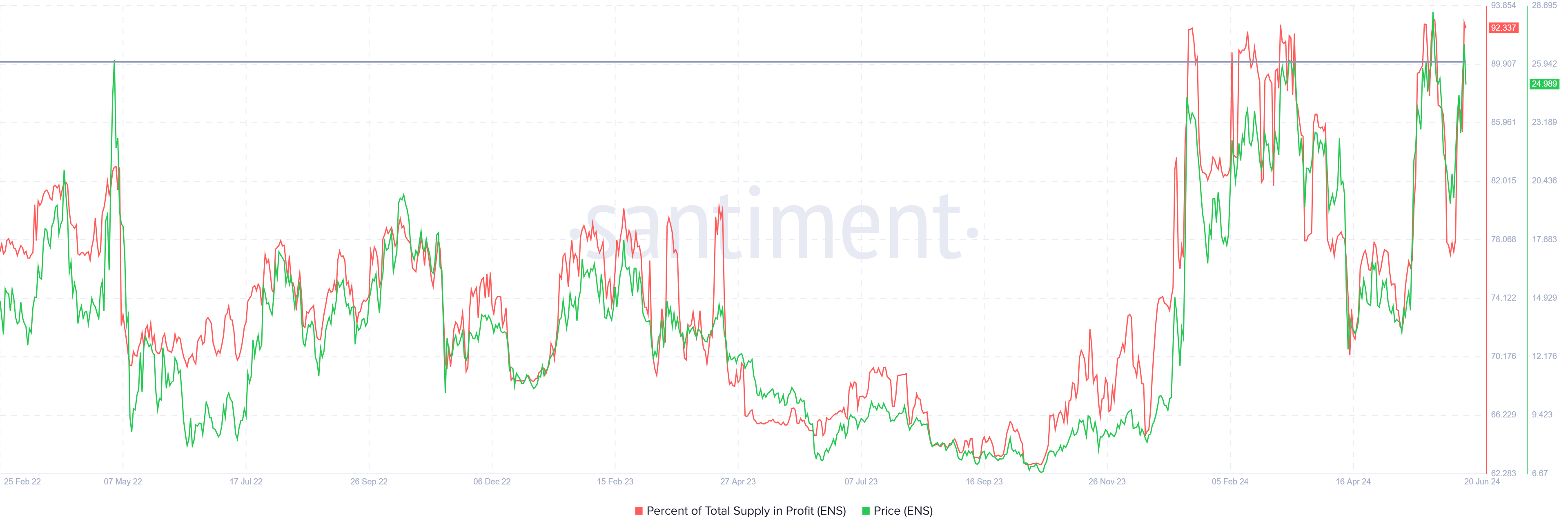 過去10日間、ENS価格は大幅な上昇を記録し、その結果、利益の総供給量は90%を超えた。これはENSのマーケット・トップとなった。マーケット・トップとは、大幅な下落が始まる前の市場サイクルの最高値のこと。資産価格が下落に転じる前のピークである。
