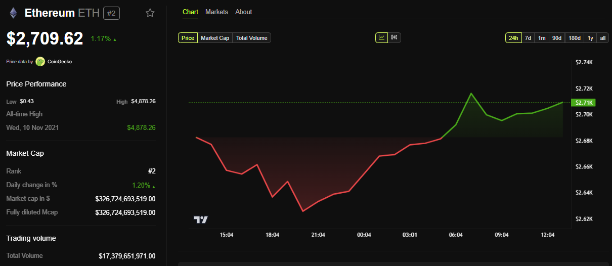Sponsoredこの報告のイーサリアムのパワリングトークンへの影響は限定的であった。BeInCryptoのデータによると、ETHは金曜日のセッション開始以来、わずか1.17%上昇している。本稿執筆時点で、トークンは2709ドルで取引されていた。