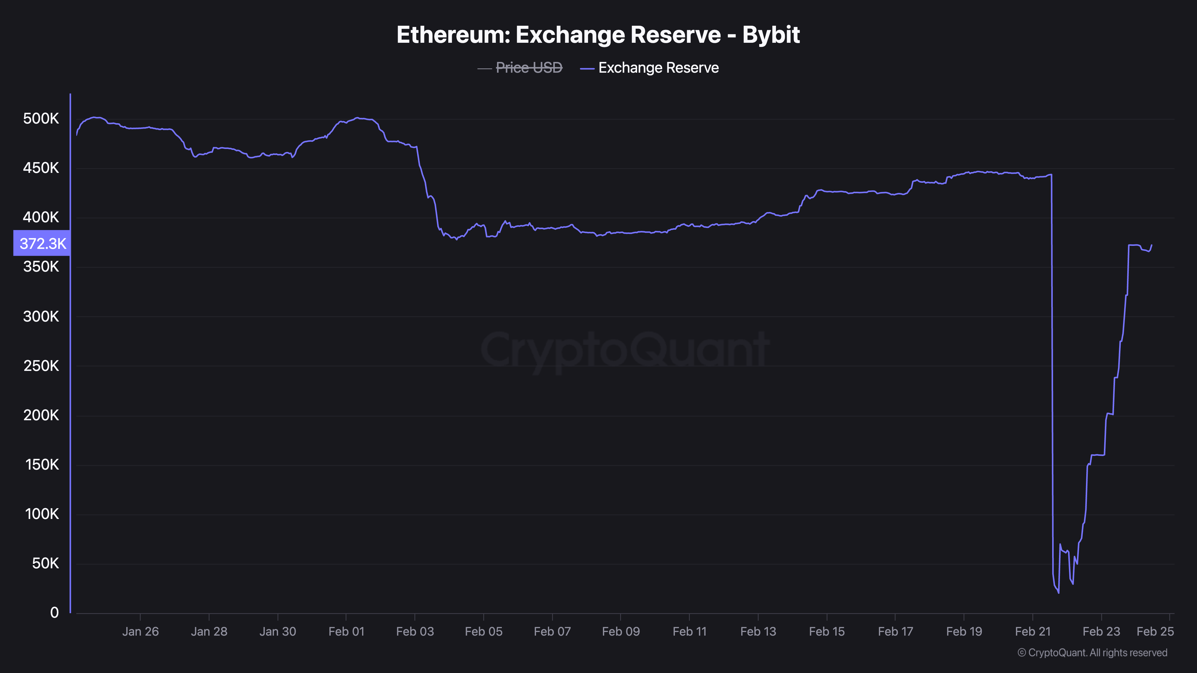 ハッキング後、Bybitでのイーサリアムの供給が劇的に減少し、1日で443000ETHからわずか20250ETHに急落した。