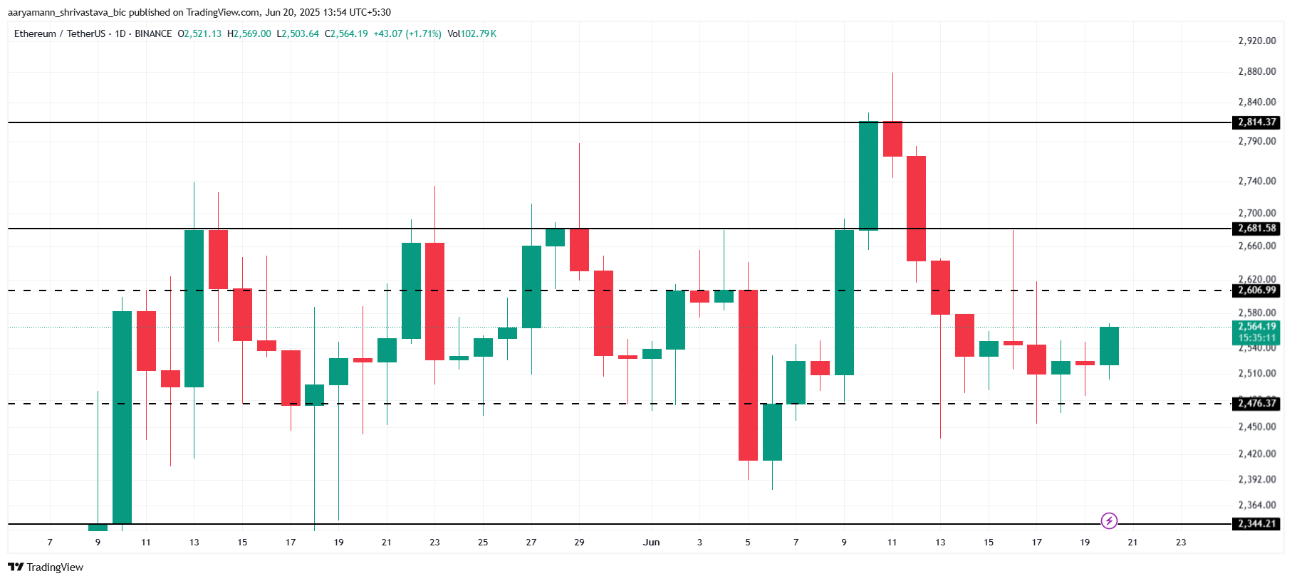 イーサリアムは現在2564ドルで取引されており、2681ドルから2476ドルの統合レンジに留まっている。最近のボラティリティにもかかわらず、ETHはこの価格ゾーンから抜け出せていない。2681ドルを超える動きが確保されるまで、価格はこの狭いレンジ内に留まり、どちらの方向にも急激な動きがすぐに反転する可能性がある。