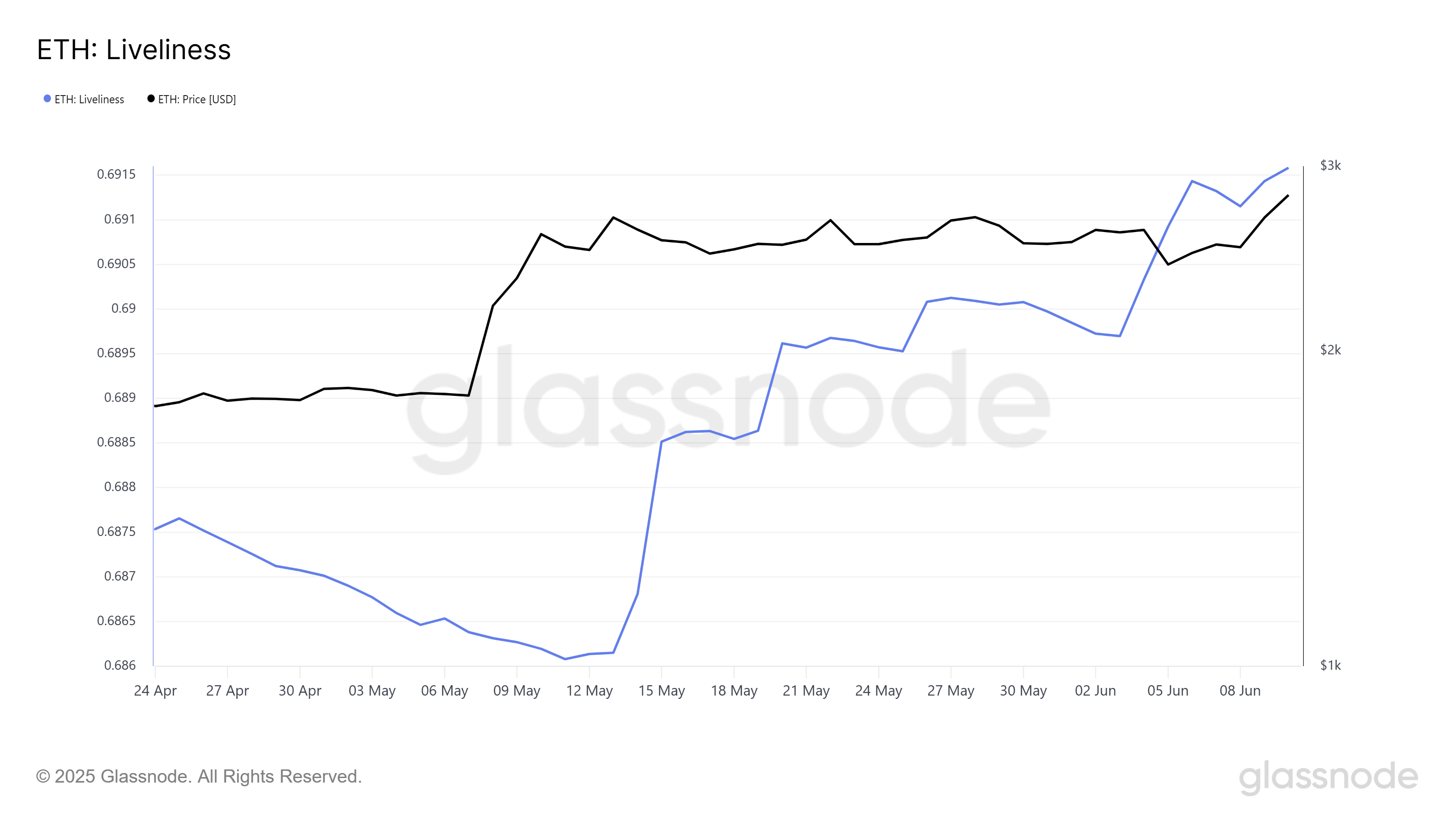 ライヴリネス指標は今週も上昇を続けており、長期保有者(LTH)が保有をますます売却していることを示している。ライヴリネスはコインがウォレットからどれだけ頻繁に移動されるかを測定し、この指標の上昇は売り圧力を示している。