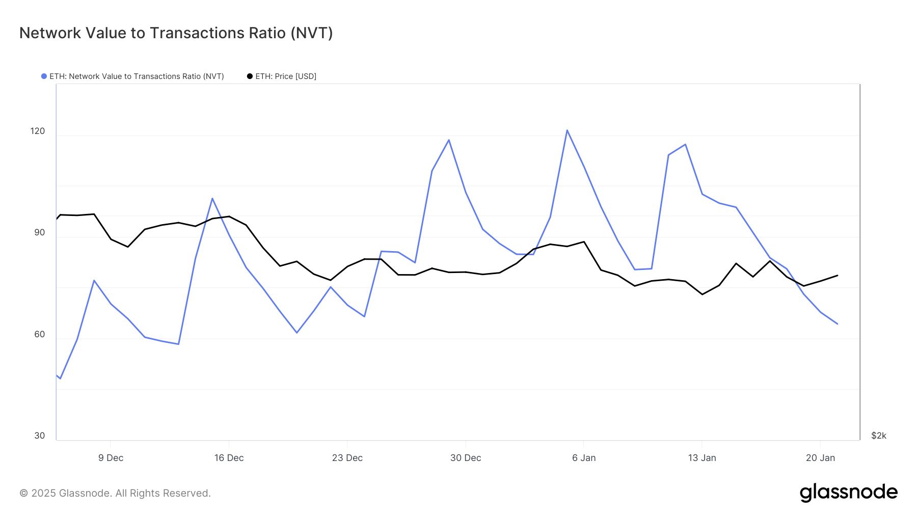 イーサリアムのネットワーク価値対取引(NVT)比率は低下しており、最近月間最低値に達しました。低いNVTは、取引活動がネットワーク価値とバランスが取れていることを示し、ボラティリティの低下を反映しています。これは、イーサリアムが立ち直るために急務である価格回復に適した環境を作り出します。