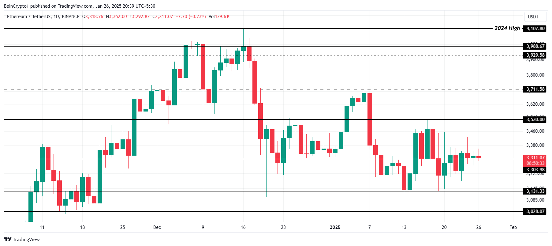 イーサリアムの価格は現在、3303ドルのサポートレベルを上回っている。3530ドルの障壁を突破しようとしたが失敗した。先週、暗号資産は3131ドルに下落し、上昇傾向を維持するための継続的な苦闘を浮き彫りにしている。