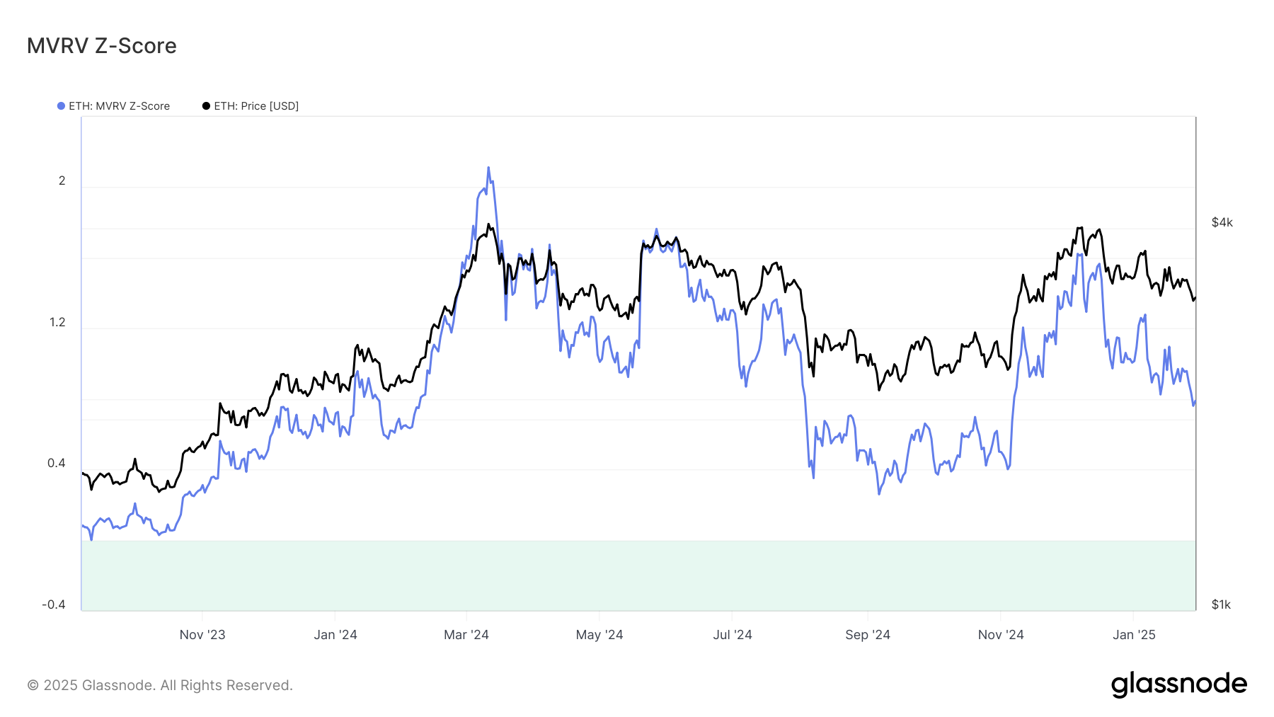 イーサリアムのマクロモメンタムは、回復の可能性に対して依然として好意的である。MVRVスコアは現在1.0を下回っており、ETHが歴史的な市場サイクルと比較してまだ過小評価されていることを示している。この指標は市場の底を示す緑のゾーンには近くないが、市場のトップを示す赤のゾーンからも遠い。