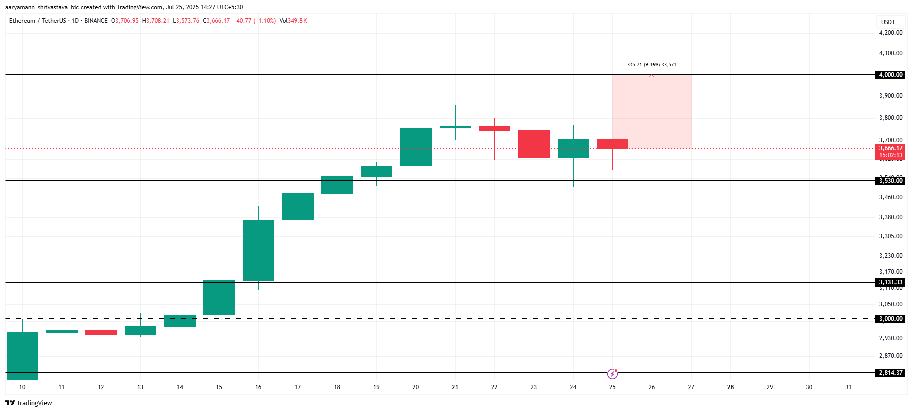 イーサリアムは現在3666ドルで取引されており、過去7か月間多くの投資家が待ち望んでいた重要な4000ドルの抵抗まであと9%のところにある。アルトコインは最近の調整にもかかわらず上昇の勢いを続け、近いうちに4000ドルを突破する可能性がある。