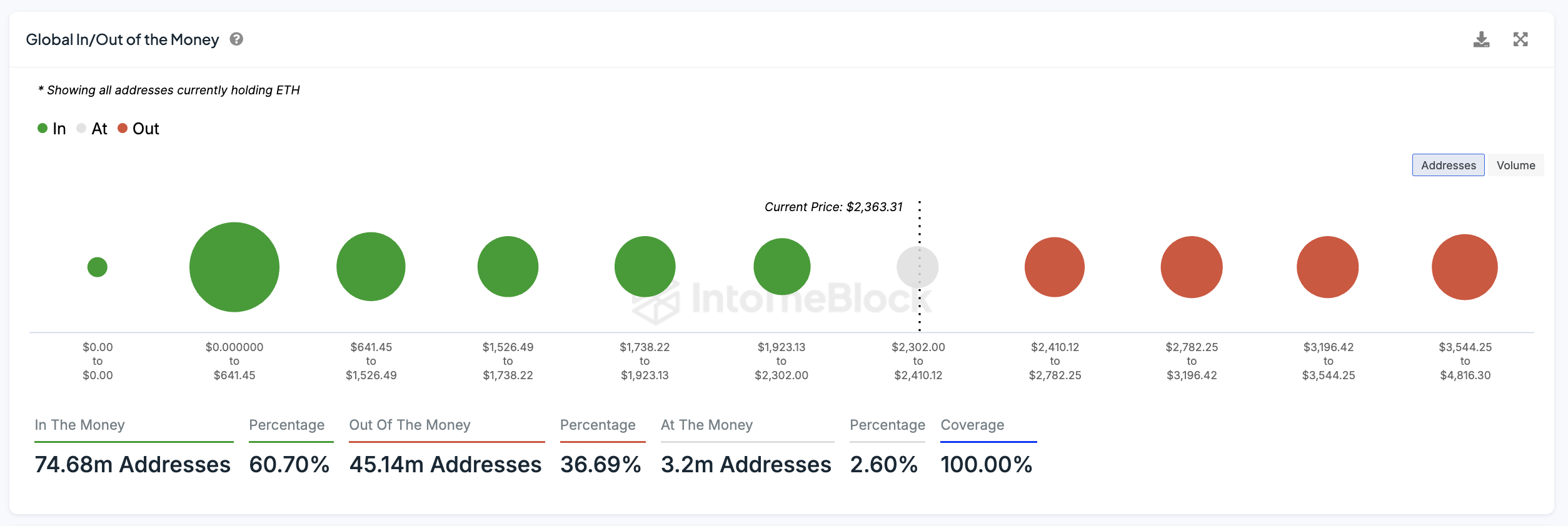 Global In/Out of the Moneyメトリックは、現在の価格に基づいて利益を出している(in the money)か損失を出している(out of the money)かのアドレスの分布を特定します。これは、購入と売却の圧力が見つかる可能性のあるクラスターを示します。これにより、トレーダーはETHが重要な抵抗または支持に遭遇する可能性のある主要な価格レベルを評価するのに役立ちます。