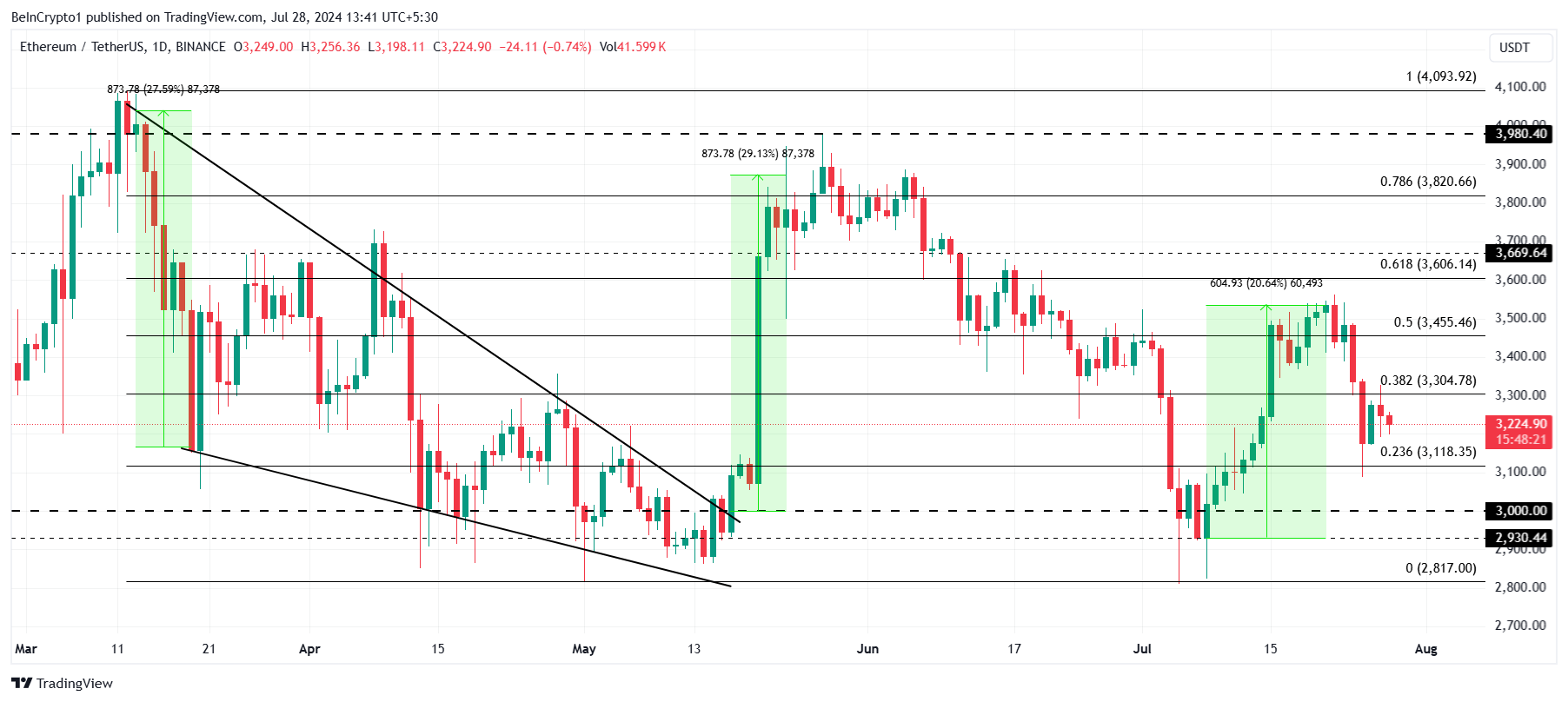 ETHは3,304ドルの38.2%フィブラインの下で停滞しており、これを突破しようとしている。しかし、これを超えて上昇し、3,455ドルの50%フィブラインを突破する可能性は難しいかもしれない。
