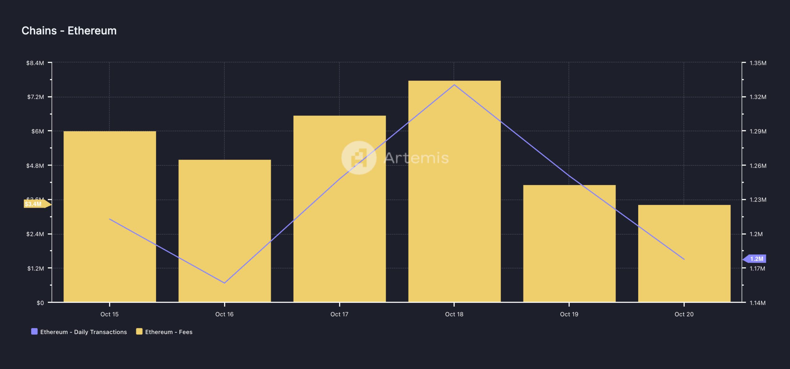 Artemisのオンチェーンデータもこの減少を確認しています。過去1週間で、イーサリアムのオンチェーンインタラクションの日別カウントは3%減少しました。
