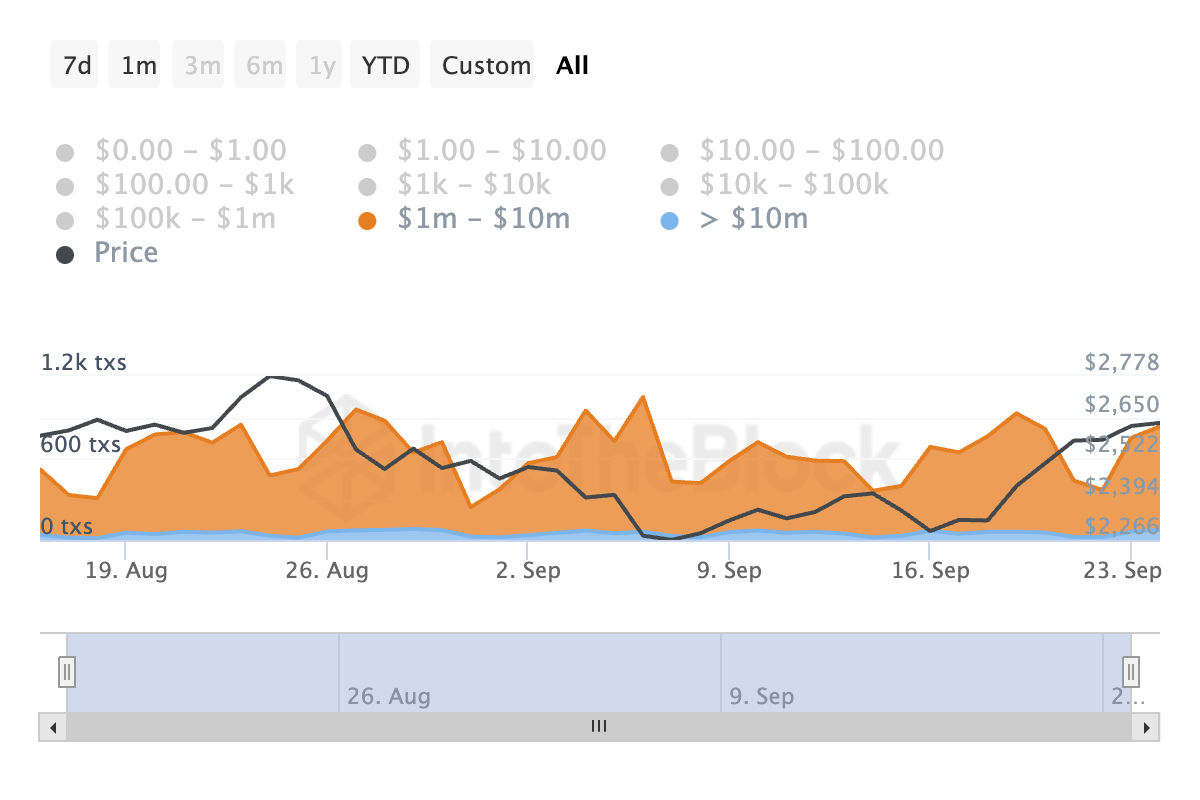 最近のイーサリアムの価値の急上昇は、大口保有者(クジラ)の活動の増加によって部分的に推進されています。オンチェーンデータによると、過去1ヶ月間にETHが関与する重要な取引が着実に増加していることが明らかになりました。