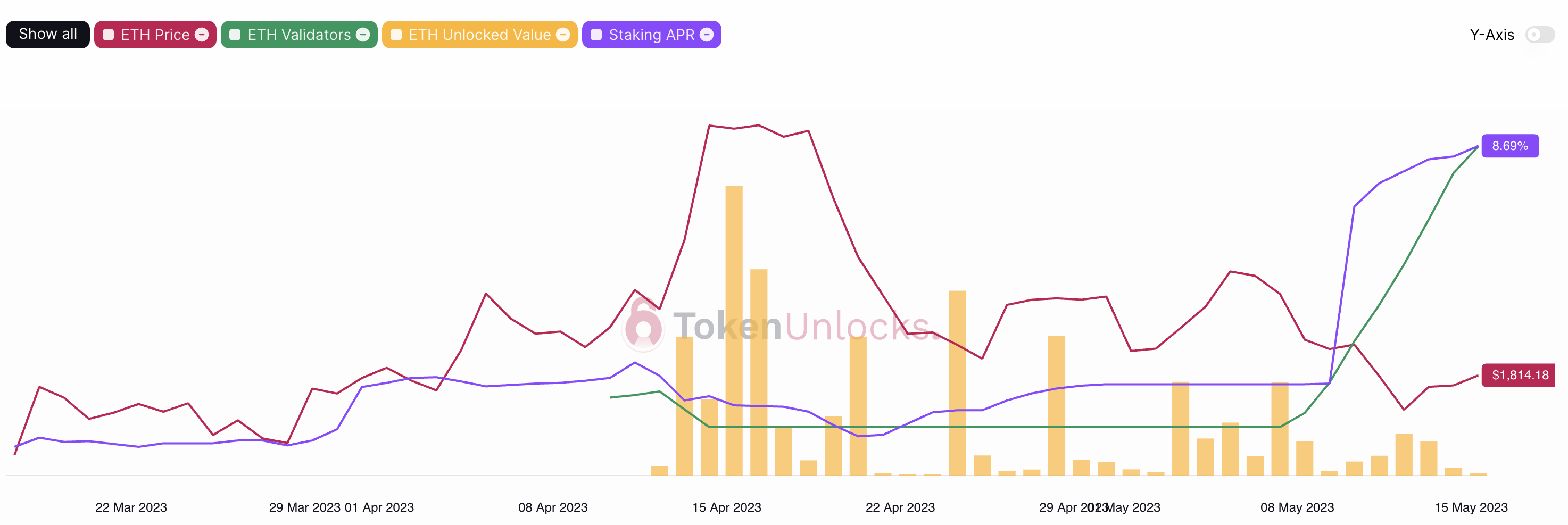 暗号資産(仮想通貨)分析プラットフォームToken Unlocksによると15日、イーサリアム・ステーキングのAPRが過去最高水準となる8.76%を記録した。イーサリアムは4月13日、大型アップグレードShapella(上海)の実装を完了。これを受け、当時ステーキングされていた約1,800万ETHおよび、バリデータノードのステーキング報酬引き出しが可能となっていた。