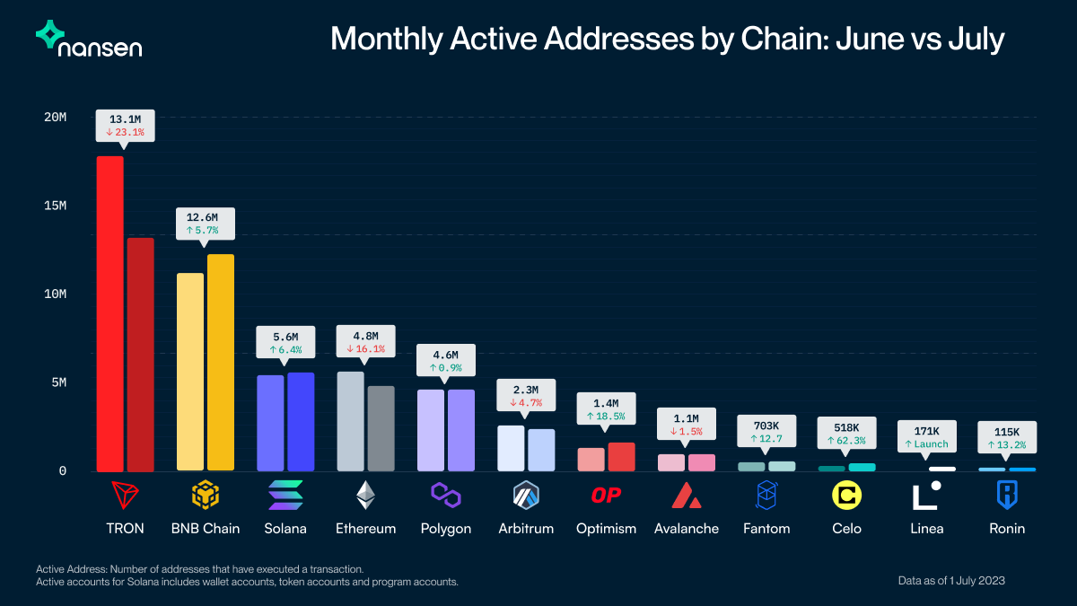 一方、トロン・ネットワークは6月から7月にかけて、月間のアクティブ・アドレス数でイーサリアムを大幅に上回っている。同指標は、トランザクションを実行するユニークなウォレット・アドレス数を集計したもの。ネットワーク需要を計測する重要指標とされ、アクティブ・アドレス数の増加はそのブロックチェーンの基軸通貨に上昇圧力をかける場合が多い。