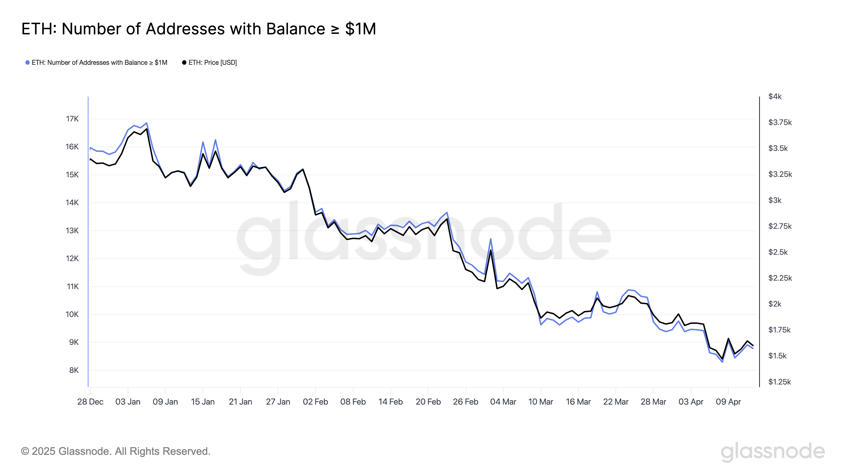 それにもかかわらず、低調なパフォーマンスは投資家を遠ざけている。Glassnodeのデータによれば、少なくとも100万ドルのETHを保有するアドレスの数は年初来で急減している。先週、これらのアドレスは2023年1月以来の低水準にまで落ち込み、高額投資家の信頼が著しく低下していることを示している。