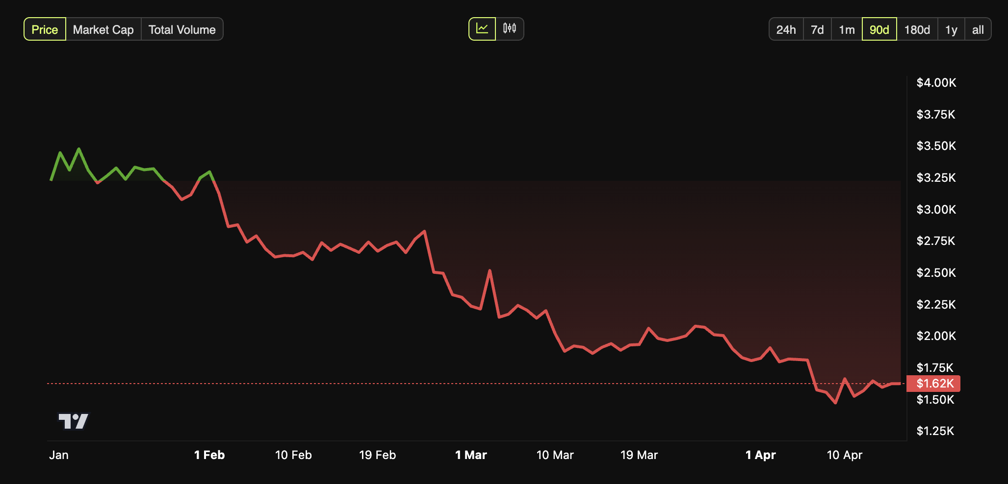 それにもかかわらず、関税の一時停止がETHの小幅な回復を引き起こした。本稿執筆時点で、イーサリアムは1623ドルで取引されており、過去1日で0.3%の小幅な上昇を見せている。