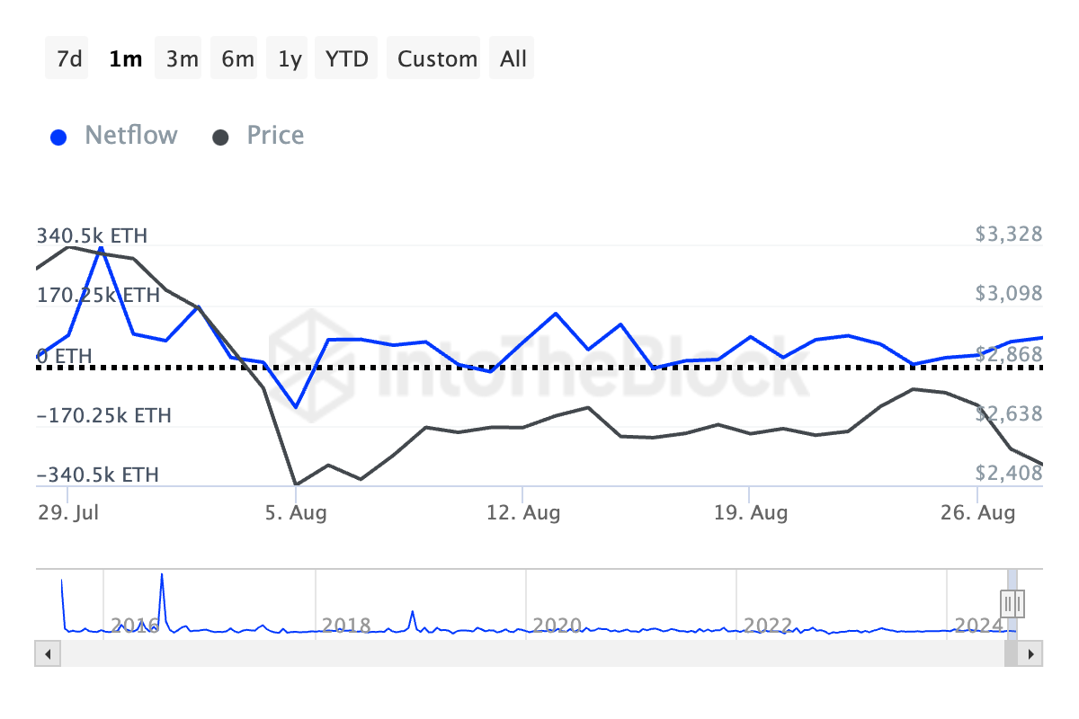 大口保有者のネットフローは、これらのクジラが購入するETHの量と特定の期間に販売するETHの量との差を測定します。
