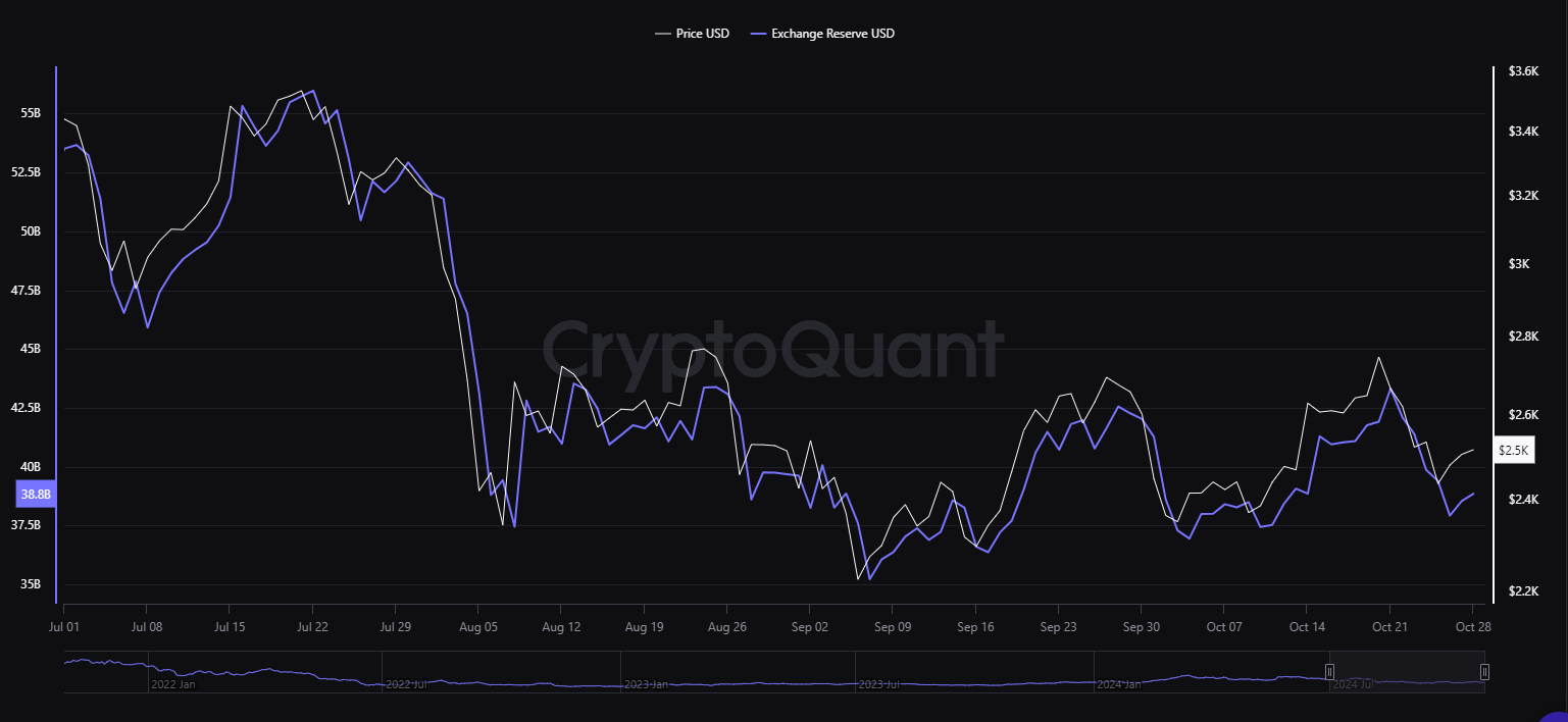 CryptoQuantのデータは、イーサリアムの取引所での保有量が420億ドルから389億ドルに減少したことを示しています。これは、取引所から4億ドル以上のETHが引き出されたことを反映しています。