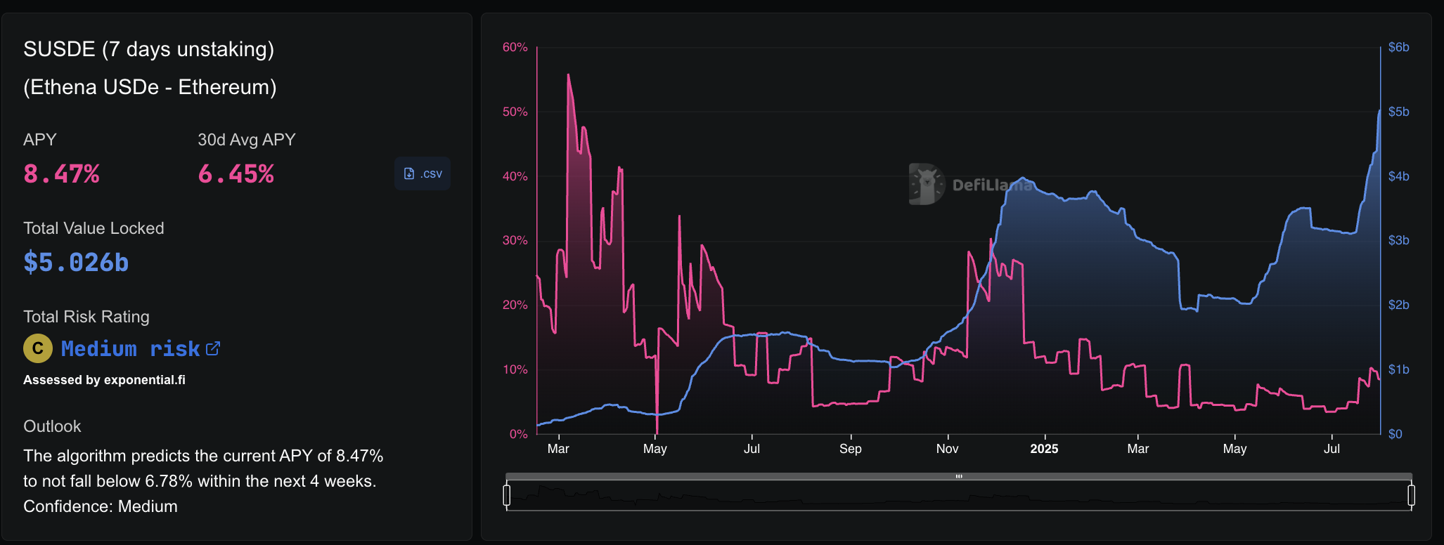 Duneのデータによると、USDeの総供給量は4月30日から約80%増加し、約46億6000万ドルから80億3000万ドルを超える水準にまで拡大した。さらに、ステーキングされたUSDeの比率も約45%から56.3%へと高まっており、これらの安定した合成資産を活用した追加収益への市場の信頼感が強まっていることを示している。こうした状況を受け、Ethenaの総ロック価値(TVL)は81億ドルに達し、旺盛な資金流入が確認できる。