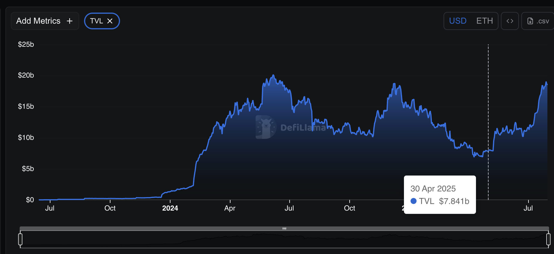 データを見ると市場がどれほど急速に加熱しているかが一目瞭然だ。EtherFiの総ロック価値(TVL)はほぼ倍増し、4月30日の55億ドルから7月30日には103.6億ドルに達した。一方、KelpDAOは同期間に10.3億ドルから16.7億ドルに成長した。