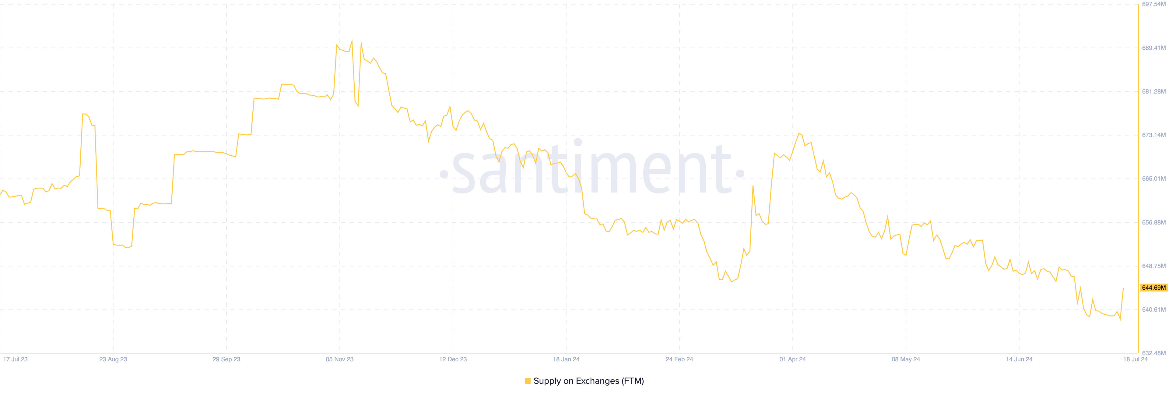水暗号通貨取引所のウォレットに保有されているFantom(FTM)コインの数は18日、2022年1月10日以来2年ぶりの低水準となる6億3900万枚に減少した。
