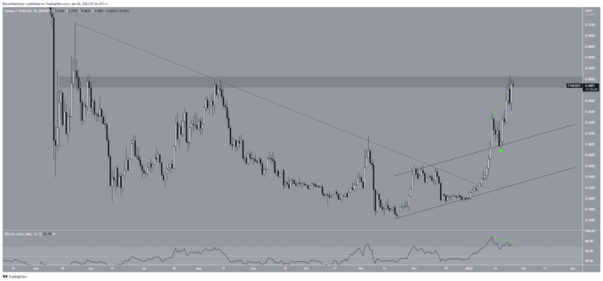 過去24時間、Fantom価格は0.41ドルのレジスタンスエリアから抜け出そうとする一方、日足RSIは弱気のダイバージェンス(緑の線)を発生させた。