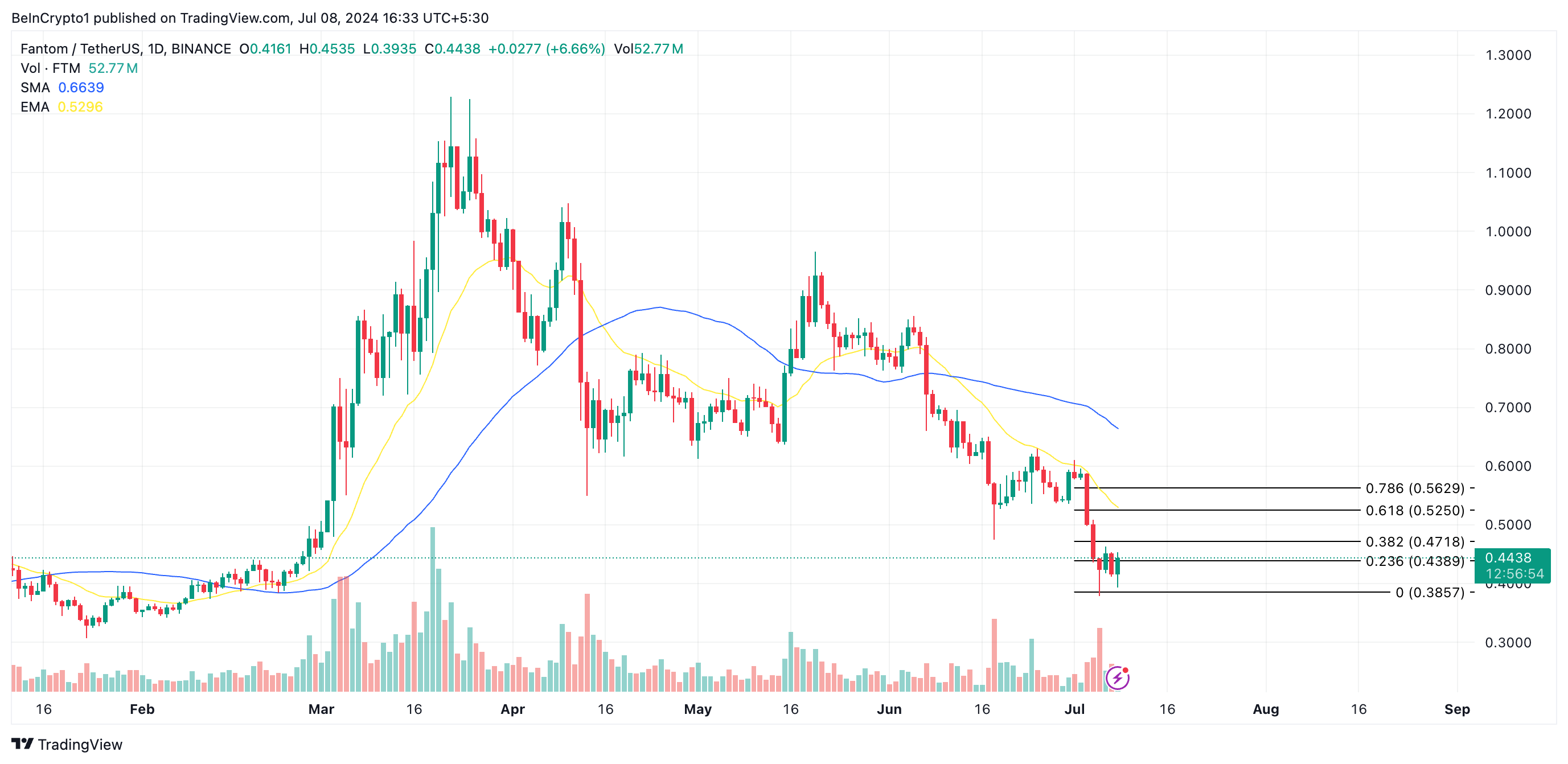 この記事を書いている時点で、FTMは0.44ドルで取引されています。このコインの価値はこの1ヶ月で約40%も急落した。このため、同コインの価格は20日指数移動平均(EMA)と50日小移動平均(SMA)の下で取引されている。
