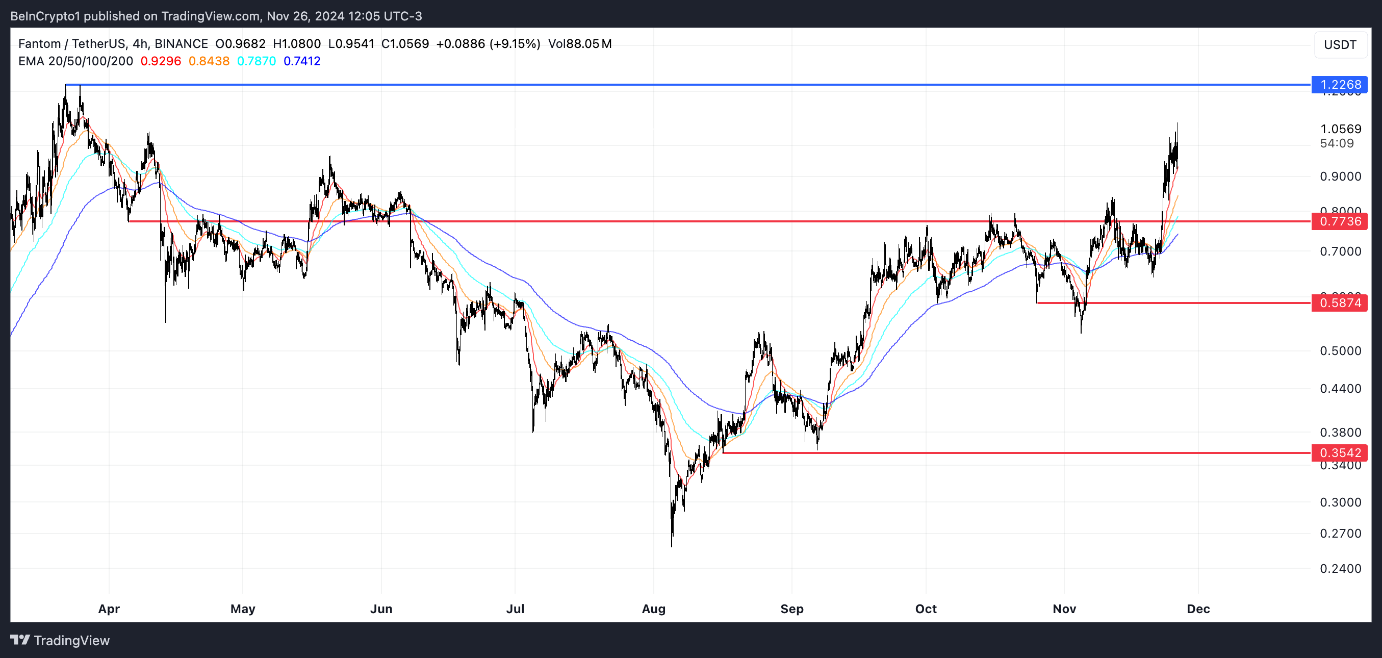 この整列は、一貫した買い圧力によって支えられた強い上昇勢いを示している。現在の上昇トレンドがさらに強化されれば、FTMの価格はさらに20%上昇し、3月以来の最高価格である1.22ドルを試す可能性がある。