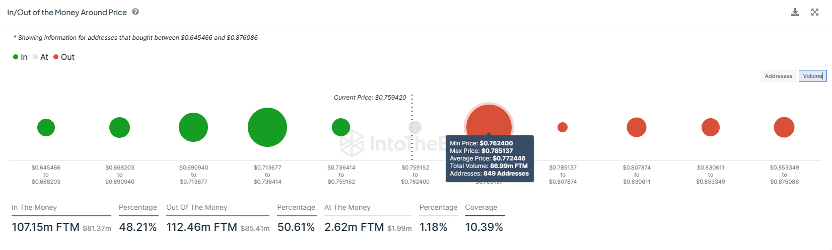 本稿執筆時点で0.76ドルで取引されているFantomの価格は、0.79ドルから0.88ドルまでマークされた抵抗ブロックの突破を試みる方向に向かっている。0.63ドルの安値から回復した後、それは先週初めにそうすることに失敗した。