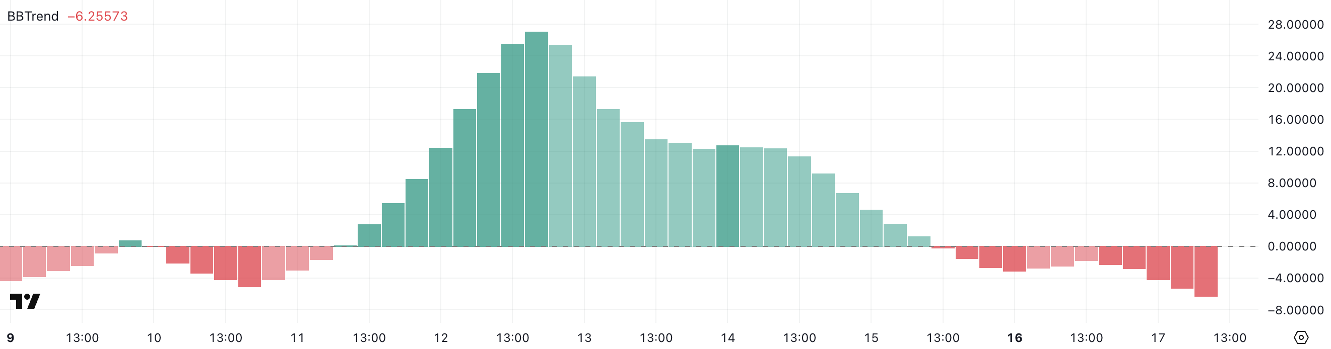 ポジティブな値は強い上昇トレンドと拡大するボラティリティを示し、ネガティブな値は弱気の勢いと収縮する価格動向を示す。