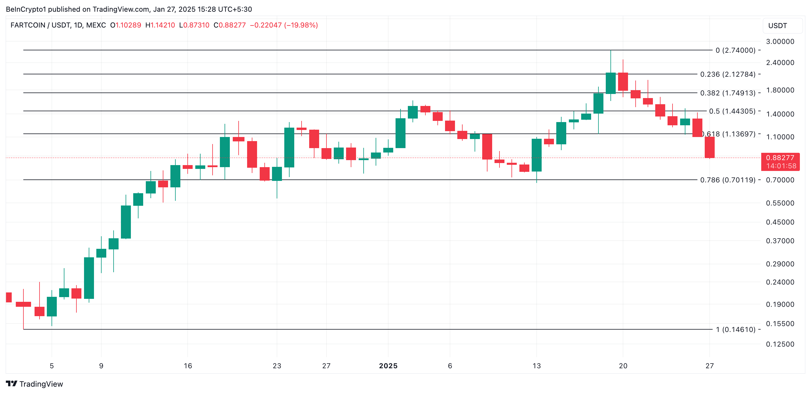 多くのソラナベースのミームコインの価値を新たな価格のピークに押し上げたミームコインブームの影響で、FARTCOINは1月19日に新たな過去最高値である2.74ドルに達した。しかし、このブームが衰退するとともに、FARTCOINの需要も減少した。その価値は66%下落し、本稿執筆時点で0.88ドルで取引されている。