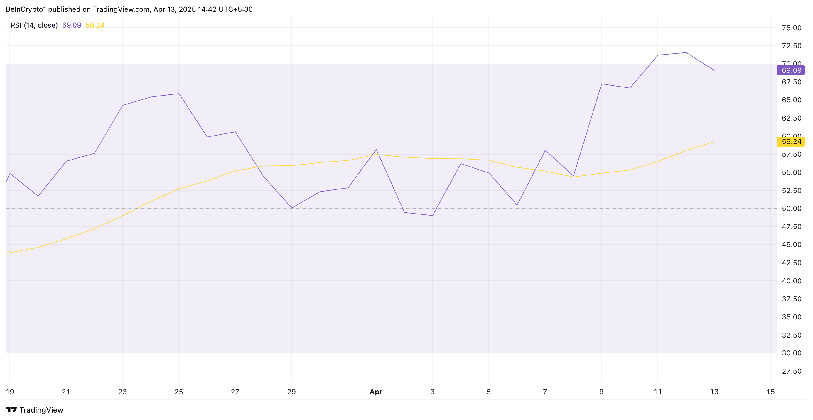 さらに、トークンの相対力指数(RSI)の読み取り値は、ほぼ買われ過ぎの状態を確認している。本稿執筆時点で、このモメンタム指標は69.09にある。