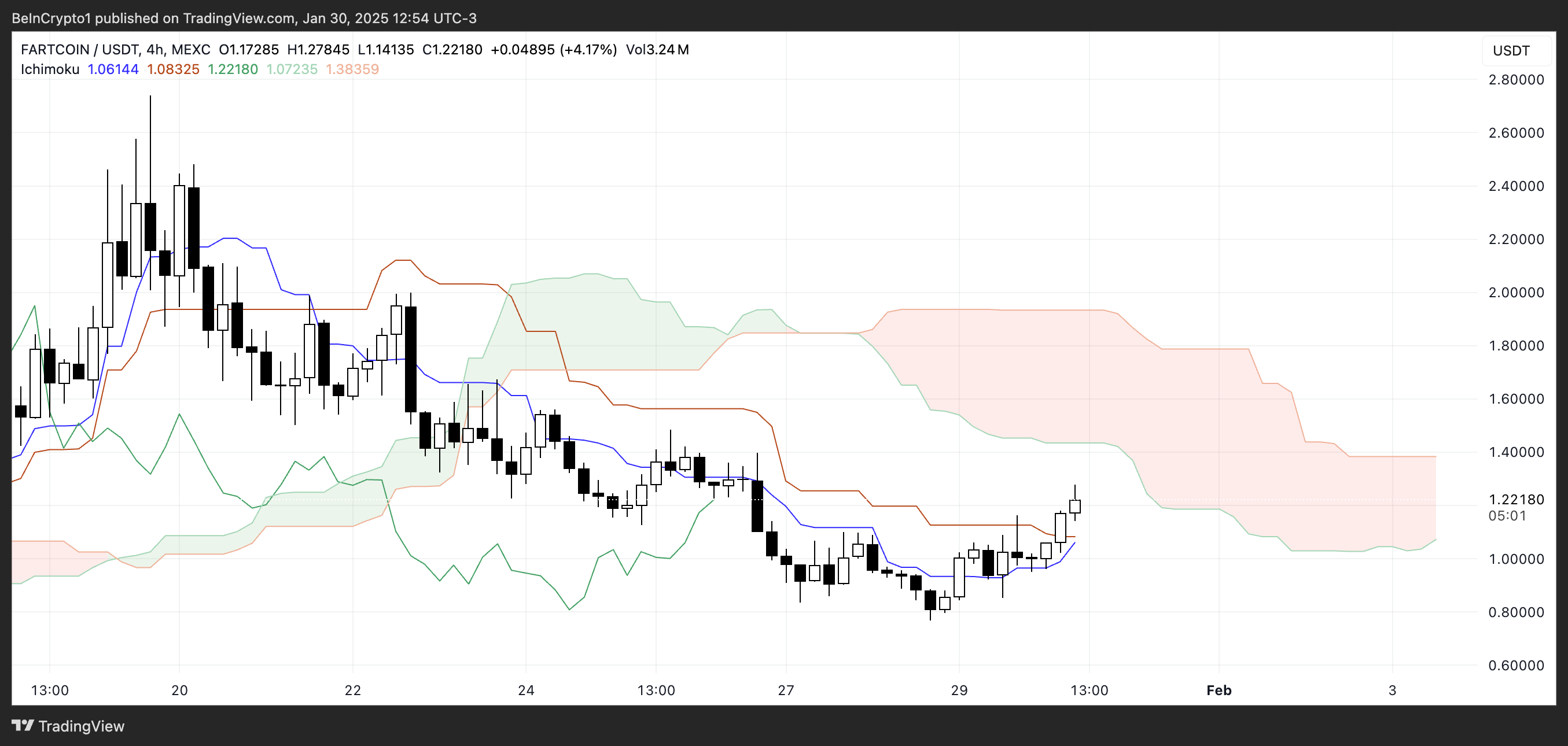 FARTCOINは、現在、ソラナ上の3番目に大きいミームコインであり、一目均衡表チャートは移行段階を示している。価格は現在、赤い雲のすぐ下で取引されている。先行する雲は弱気であり、短期的な抵抗の可能性を示しているが、転換線(青)と基準線(赤)は上向きに傾き始めている。