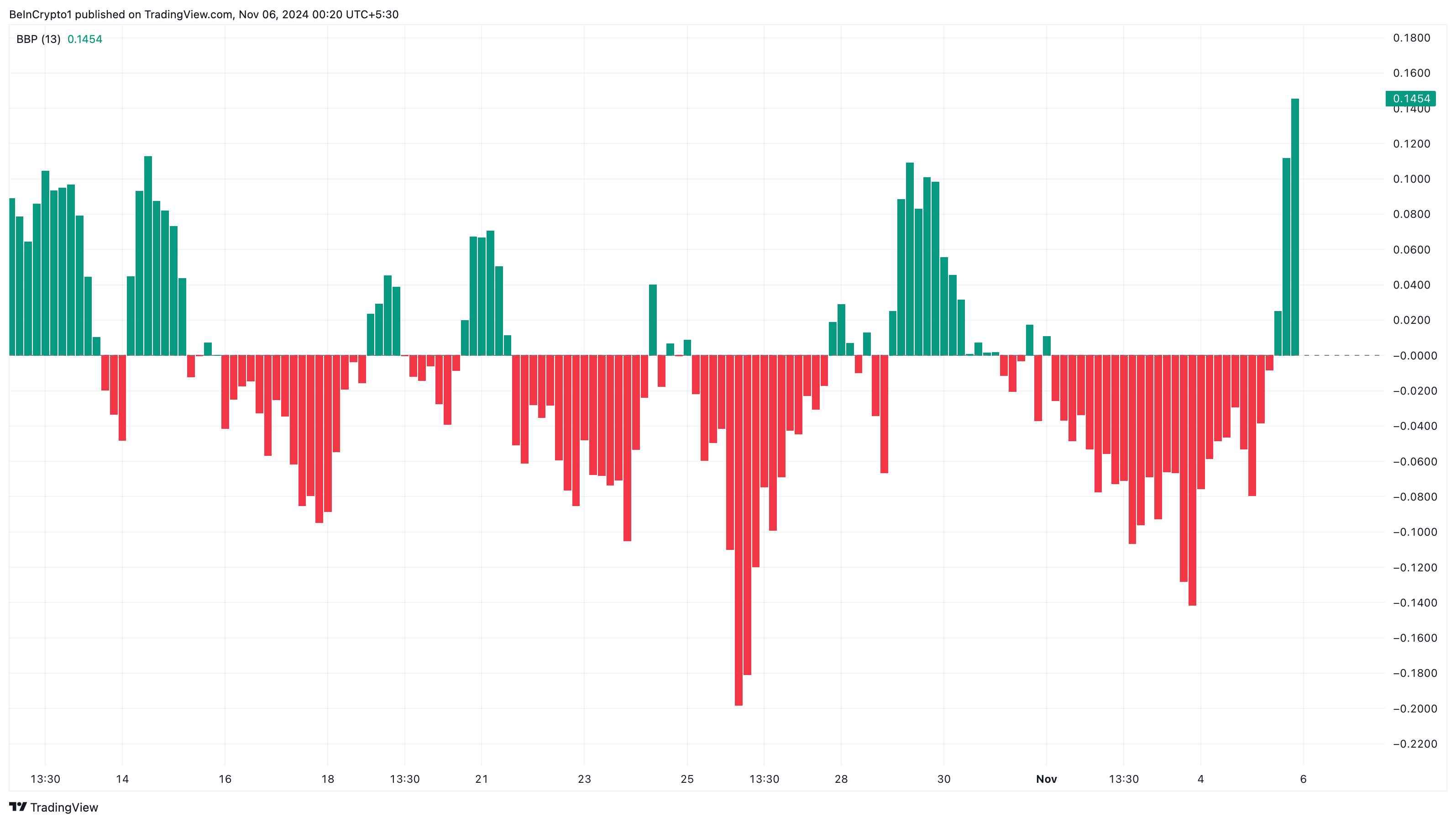特筆すべきは、Bull Bear Power(BBP)が11月1日以降赤色エリアにあったが、正の領域に跳ね上がったことである。BBPは買い手の力が売り手の力よりも強いかを示す。