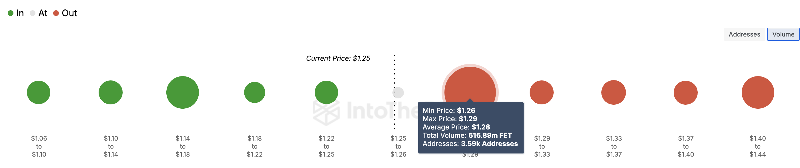 この蓄積ゾーンは重要な心理的障壁として機能する。ここに蓄積されたトークンの量は1.06ドルから1.25ドルの間に保持されている量よりも顕著に多い。これは、買い手が価格を1.28ドルを超えて押し上げることができれば、FETは強い勢いを得る可能性があることを示している。