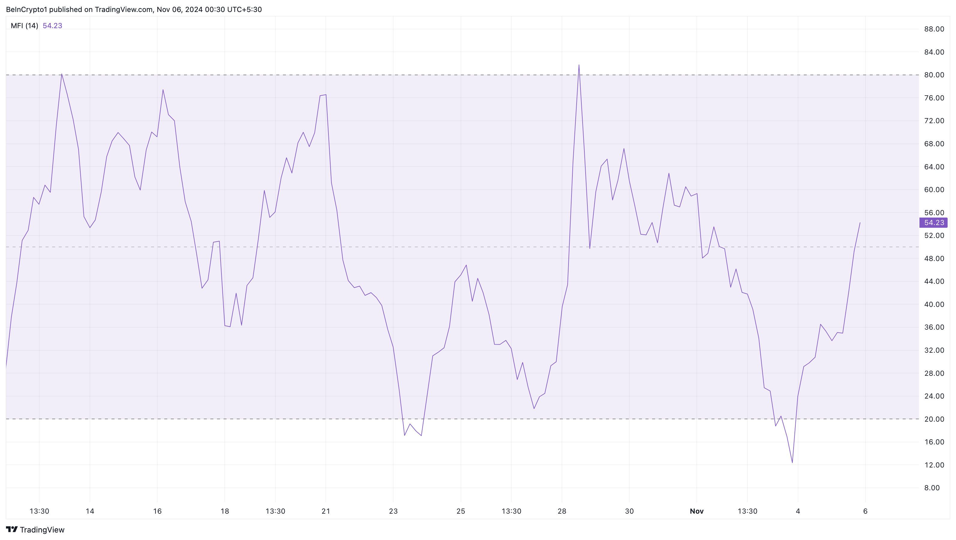 Money Flow Index(MFI)も、FETの回復が迅速である可能性を示唆する指標である。価格とボリュームのデータを分析することで購入と売却圧力を測定するMFIは、FETに対して肯定的な傾向を示している。