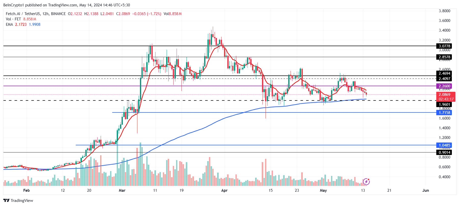 Fetch.aiの価格は1週間で12.7%下落し、1.96ドルのサポートに近い2.08ドルに位置しています。投資家の手による弱気心理の高まりは、このサポートを下回る下落を引き起こす可能性がある。