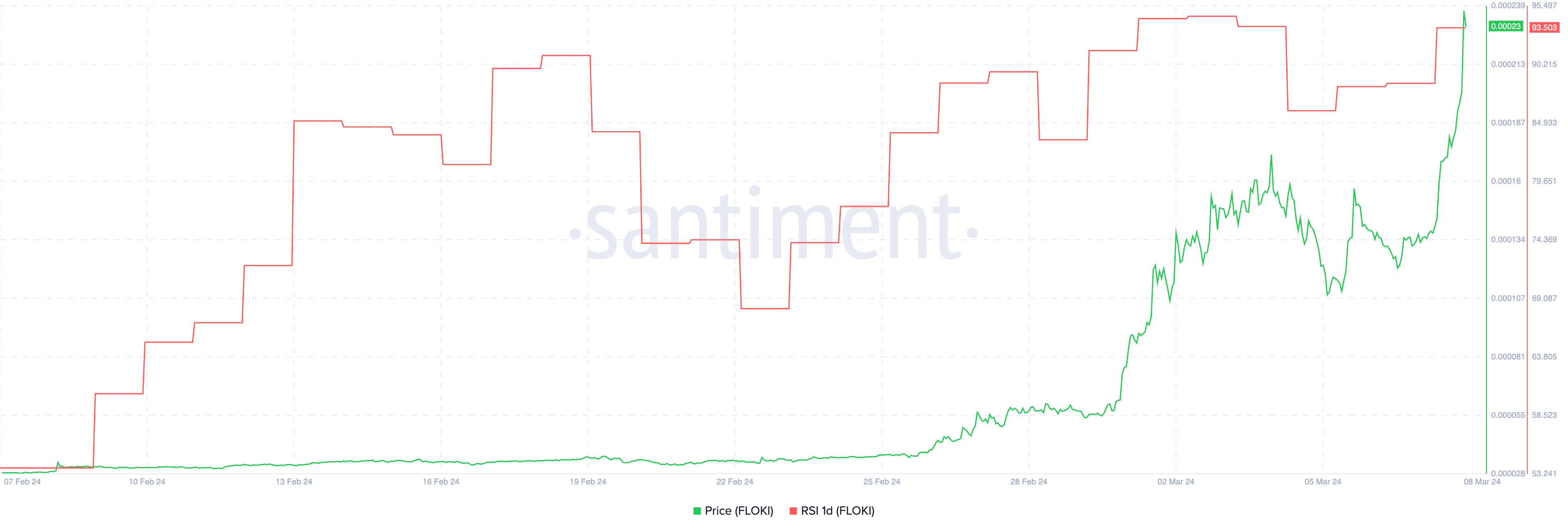 FLOKI RSI (相対力指数) 1Dは、2月9日の54から急上昇し、3月7日には93に達した。これほど高いRSIは通常、投資家にとって弱気シグナルである。FLOKIが最後に93.1以上のRSIを記録したのは2021年7月の一度きりだ。