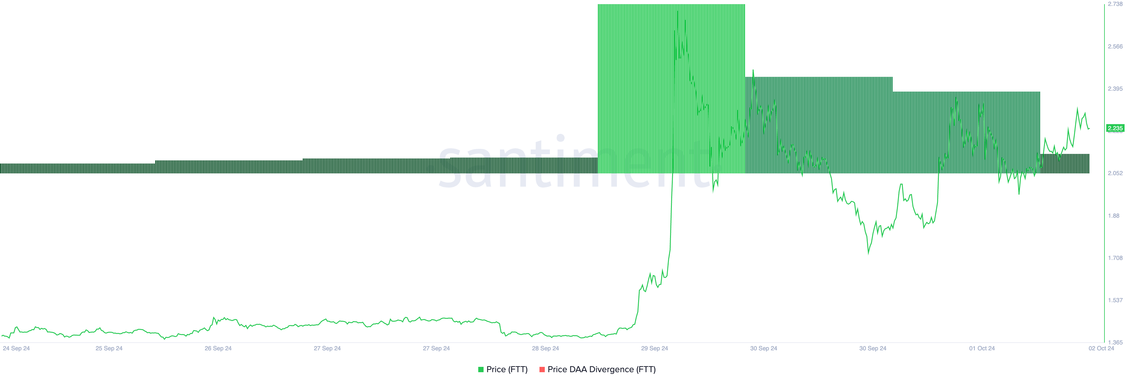 さらに、FTTの価格デイリーアクティブアドレス(DAA)ダイバージェンスからの肯定的な測定値は、アルトコインの需要が増加していることを示しています。この指標は、毎日のアクティブアドレスの数の変化に伴う資産の価格変動を測定するもので、25.46%です。