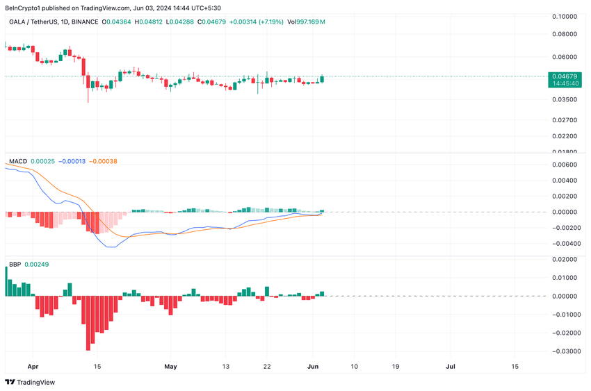 GALAに対する強気バイアスの高まりを裏付けるように、移動平均収束ダイバージェンス(MACD)インジケータの測定値は、MACDライン(青)がシグナルライン(オレンジ)とゼロラインの上にクロスする姿勢を示した。